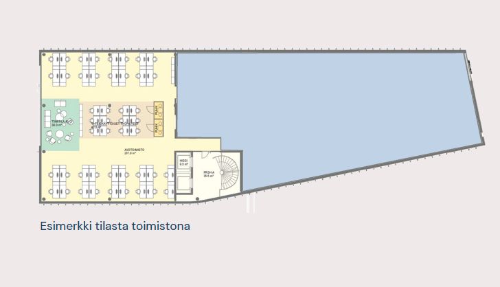 Tämä avoin 323 m² toimistotila sijaitsee kiinteistön 5. kerroksessa. Tilaa on mahdollista muunnella vuokralaisen tarpeiden mukaan.
