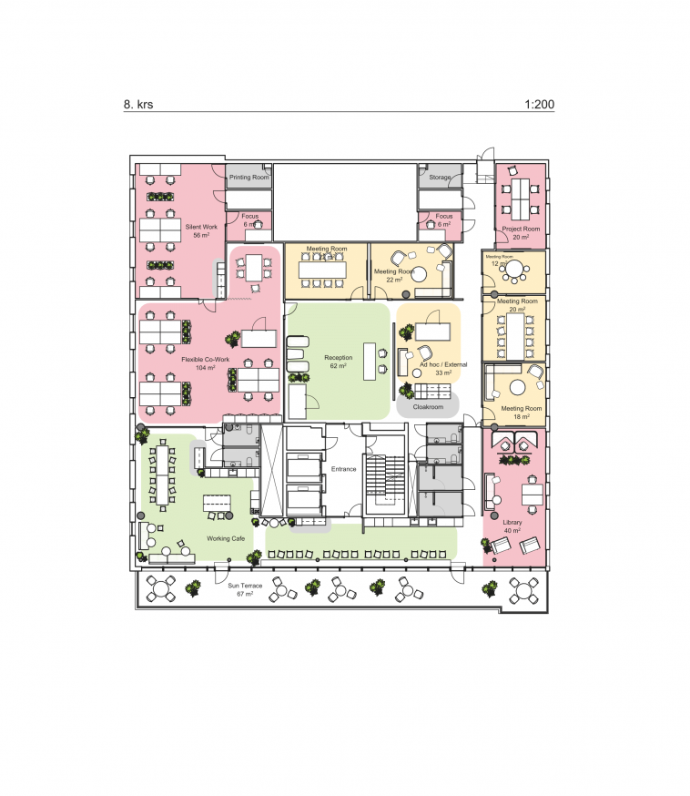 Kahdeksannen kerroksen toimistoon kuuluu sekä avotilaa että muutamia erikokoisia työhuoneita ja neuvotteluhuoneita. Lisäksi toimiston yhteydessä upea, ikioma kattoterassi, joista avautuvat näkymät Kampin kattojen ylle.