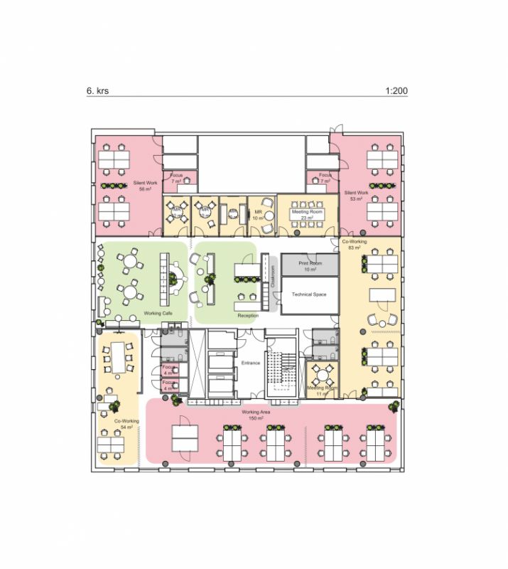 Kuudennen kerroksen toimistoon kuuluu sekä avotilaa että useampia erikokoisia työhuoneita ja neuvotteluhuoneita.