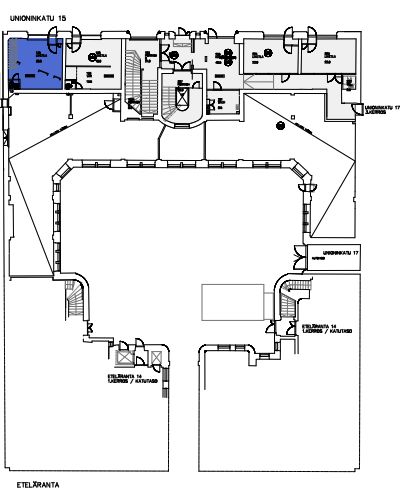Tämä 78 m² toimistoksi tai liiketilaksi soveltuva tilakokonaisuus sijaitsee kiinteistön 1. kerroksessa. Tila koostuu 32 m² liiketilasta ja 46 m² varastotilasta, johon on kulku sisärappusten kautta. Ei sovellu ravintolaksi. Liiketila sijaitsee Unioninkatu 15 puolella.