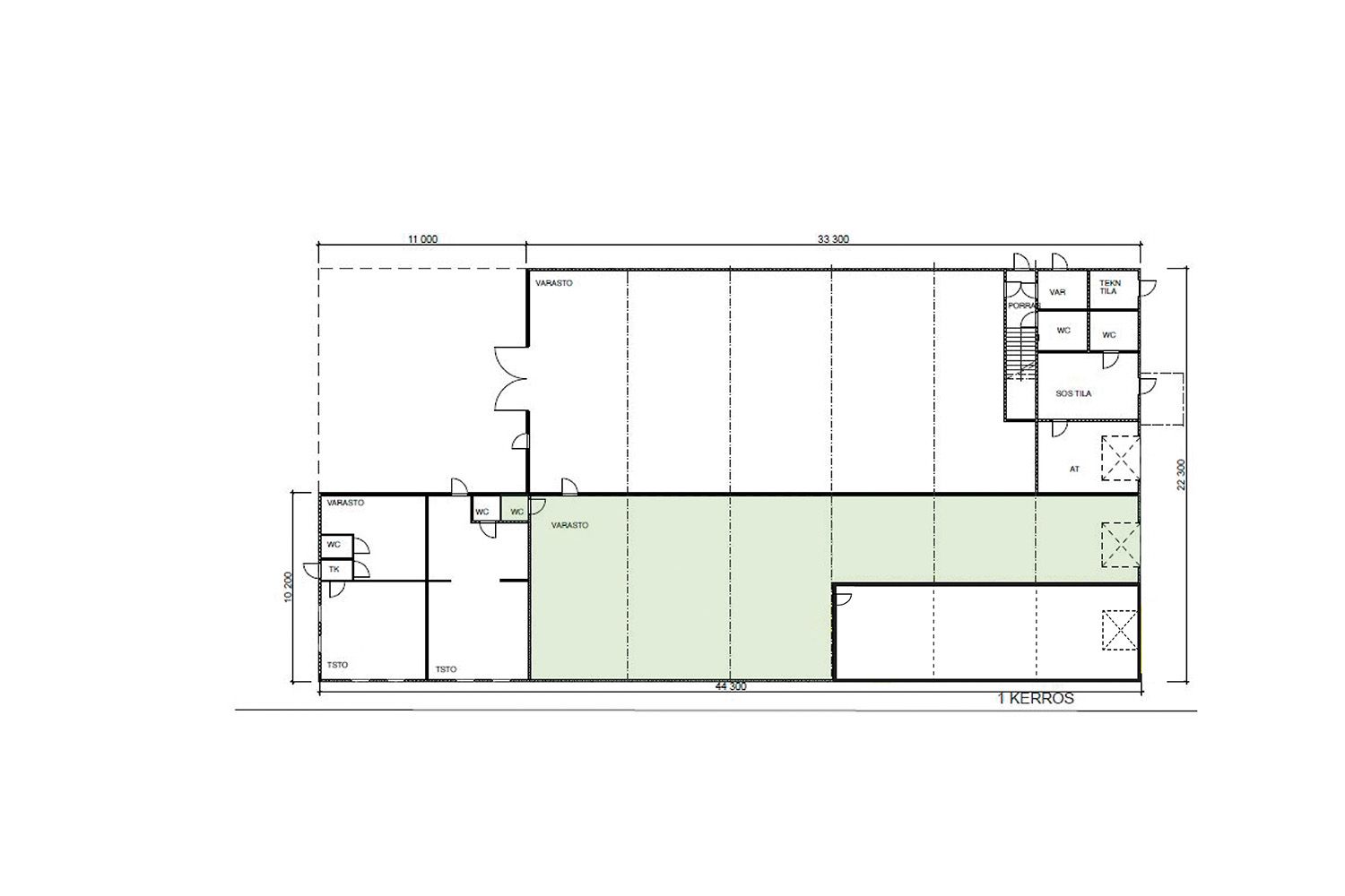 Porvoon Ölstensissä on nyt vuokrattavana tilava ja edullinen hallitila (pohjakuvaan merkitty vihreällä värillä). Tila soveltuu varastointiin ja työskentelyyn.