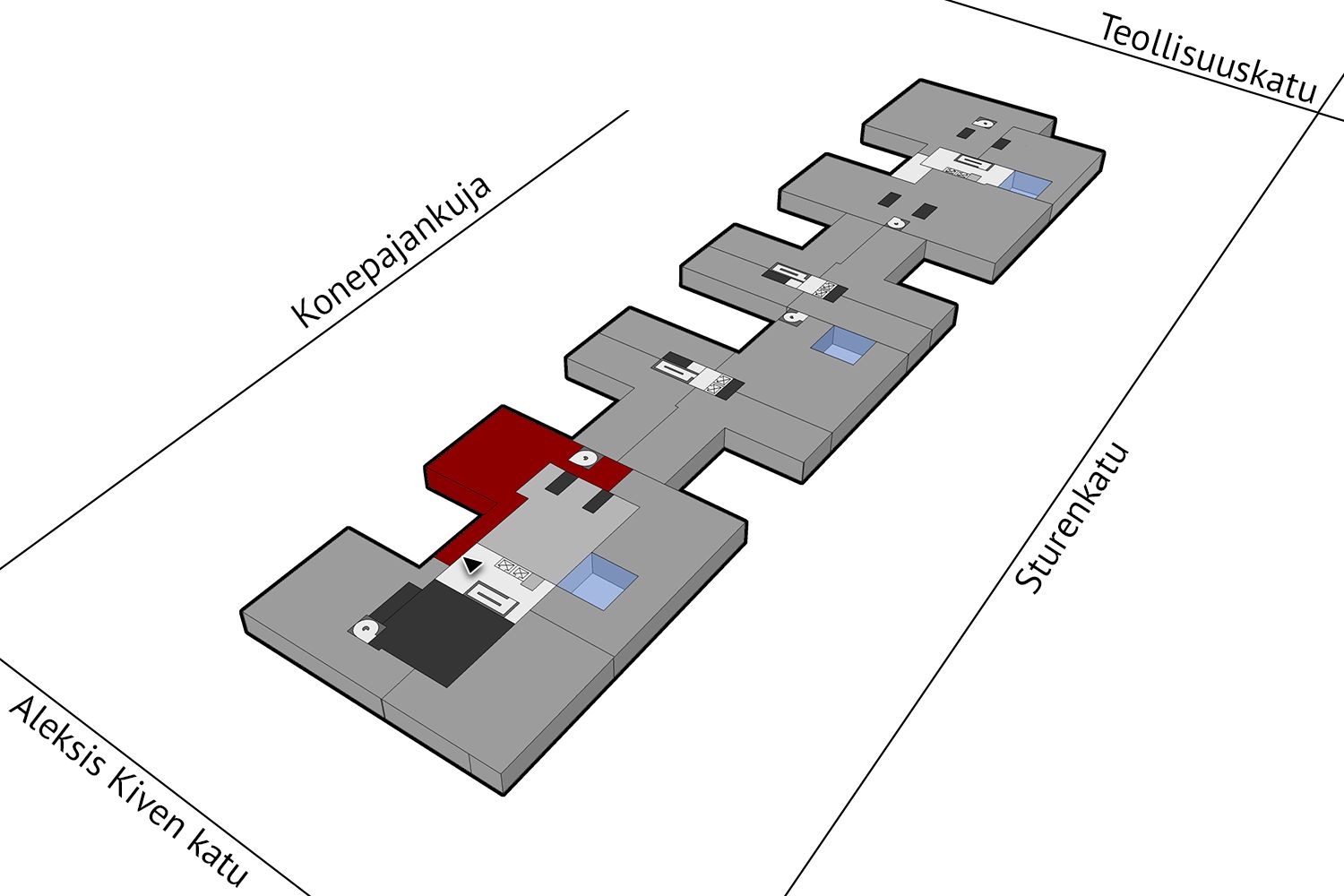 Vuokrataan ylimmän kerroksen valoisa ja moderni toimitila. Tässä tilassa runsaasti avotilaa, muutama työhuone, keittiö sekä wc:t. Ikkunoista avautuu näkymät Konepajan suuntaan.