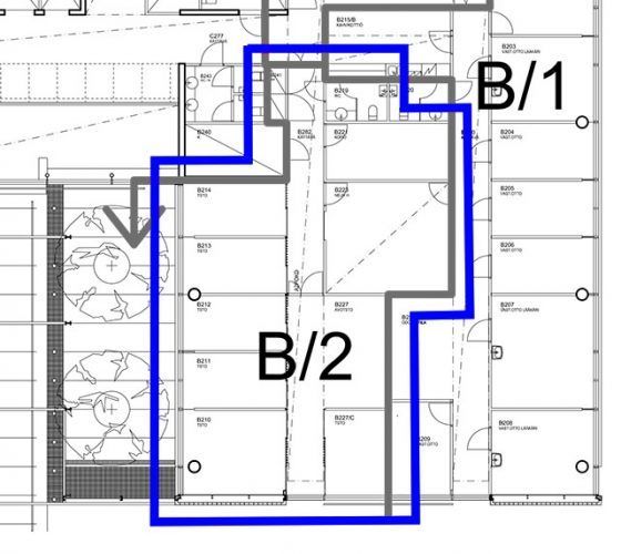 Autohallit kahdessa kellarikerroksessa (kaikki pihapaikat merkitty yrityksille / heidän asiakkailleen, henkilökunnan kaikki paikat autokellarissa).