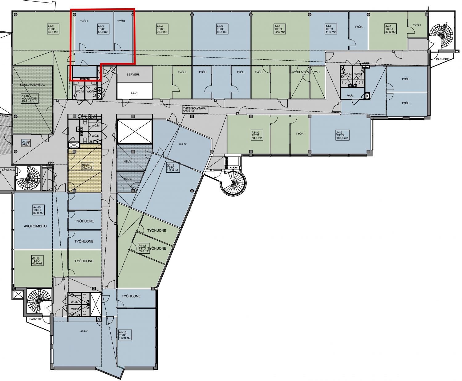 Toimistohuoneistojen pinta-alat vaihtelevat noin 40 neliön pientoimistoista 1 460 neliön koko kerroksen tiloihin. Huoneistot ovat muunneltavissa vuokralaisen työskentelytapaan sopivaksi. Sisäpihan toimistoista voi ihailla rauhoittavaa metsämaisemaa, kun taas Huopalahdentien puolen tiloissa voi kylpeä valossa. Kiinteistössä on myös erillisiä neuvottelutiloja.