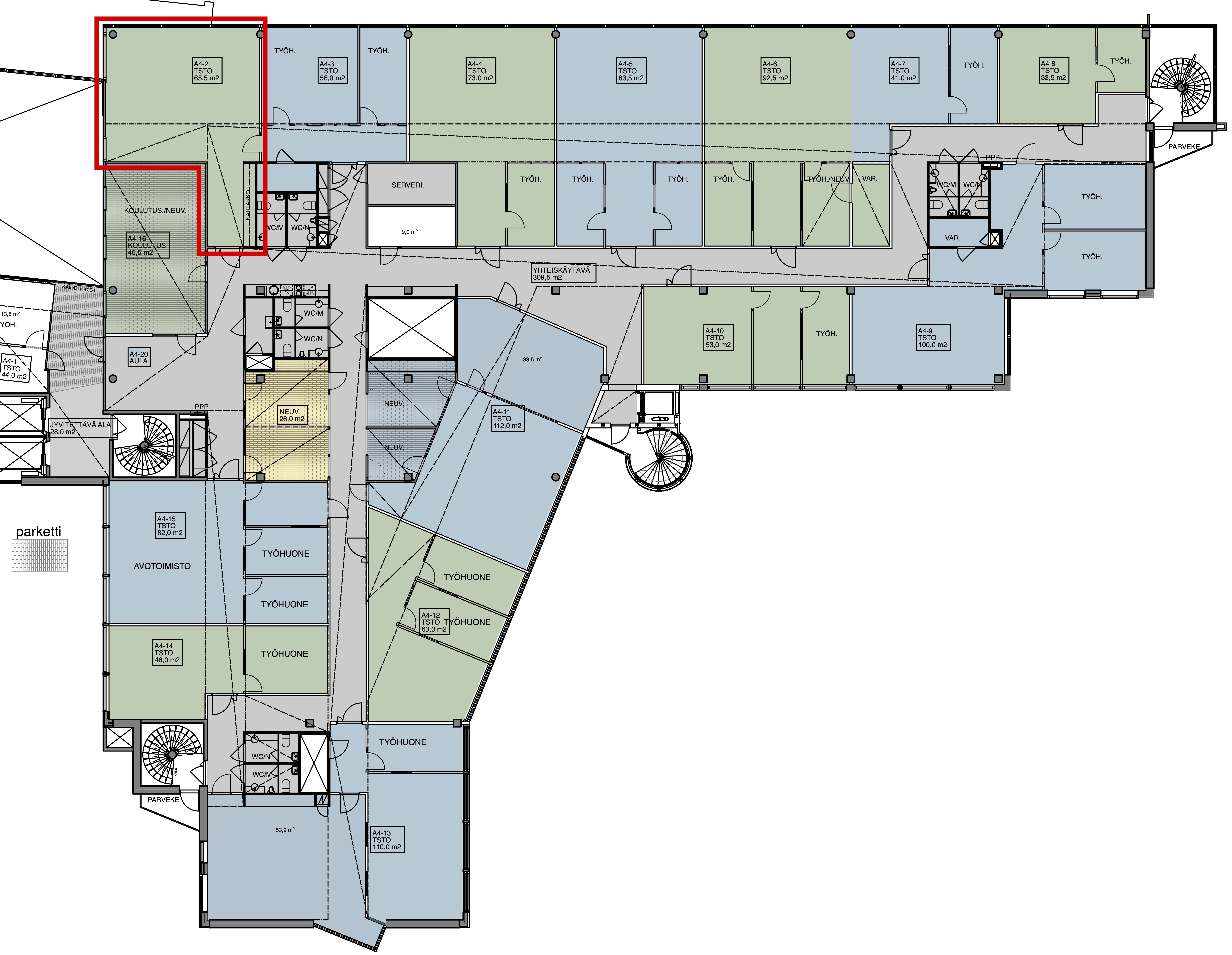 Toimistohuoneistojen pinta-alat vaihtelevat noin 40 neliön pientoimistoista 1 460 neliön koko kerroksen tiloihin. Huoneistot ovat muunneltavissa vuokralaisen työskentelytapaan sopivaksi. Sisäpihan toimistoista voi ihailla rauhoittavaa metsämaisemaa, kun taas Huopalahdentien puolen tiloissa voi kylpeä valossa. Kiinteistössä on myös erillisiä neuvottelutiloja.