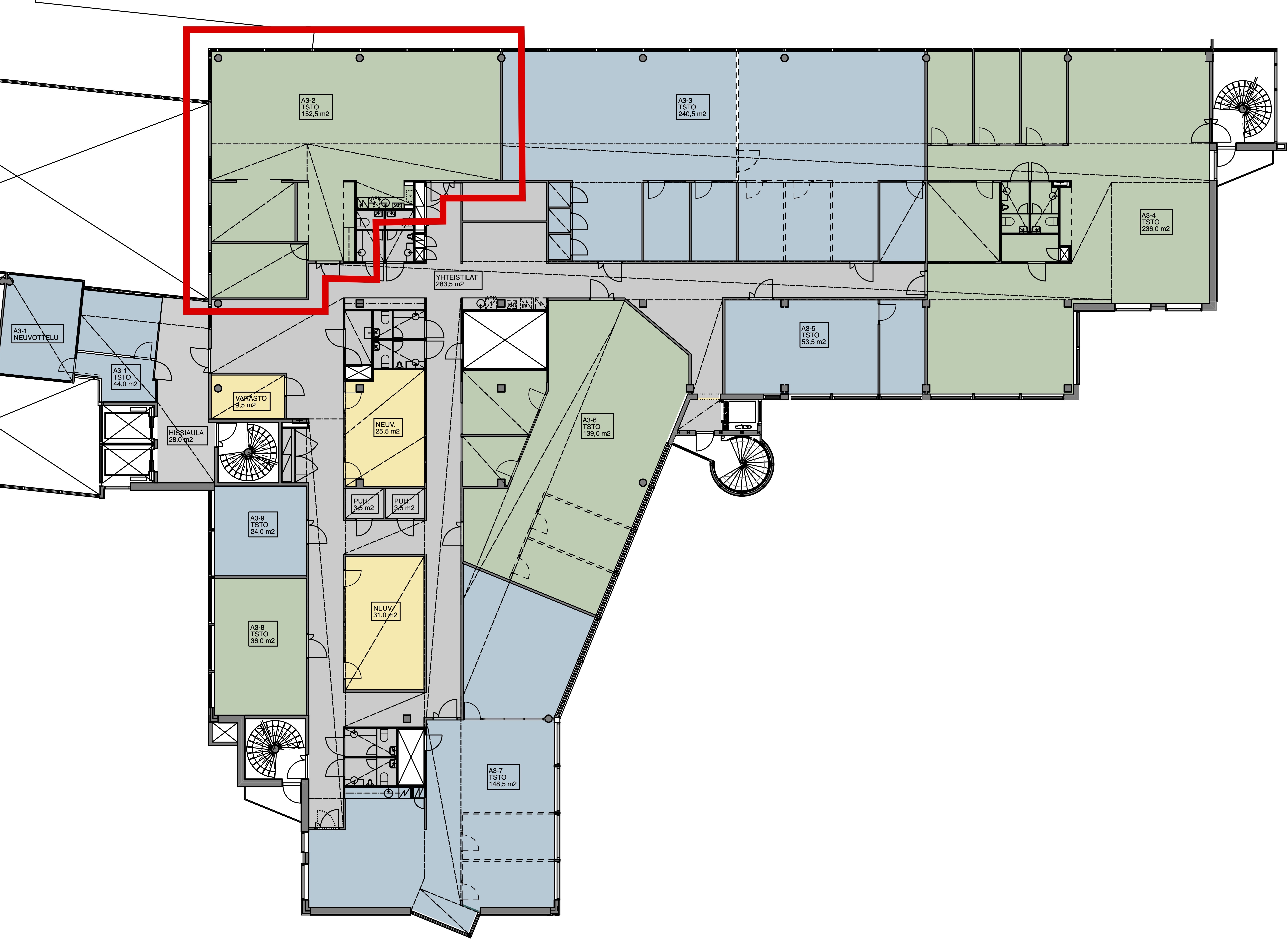 Toimistohuoneistojen pinta-alat vaihtelevat noin 40 neliön pientoimistoista 1 460 neliön koko kerroksen tiloihin. Huoneistot ovat muunneltavissa vuokralaisen työskentelytapaan sopivaksi. Sisäpihan toimistoista voi ihailla rauhoittavaa metsämaisemaa, kun taas Huopalahdentien puolen tiloissa voi kylpeä valossa. Kiinteistössä on myös erillisiä neuvottelutiloja.