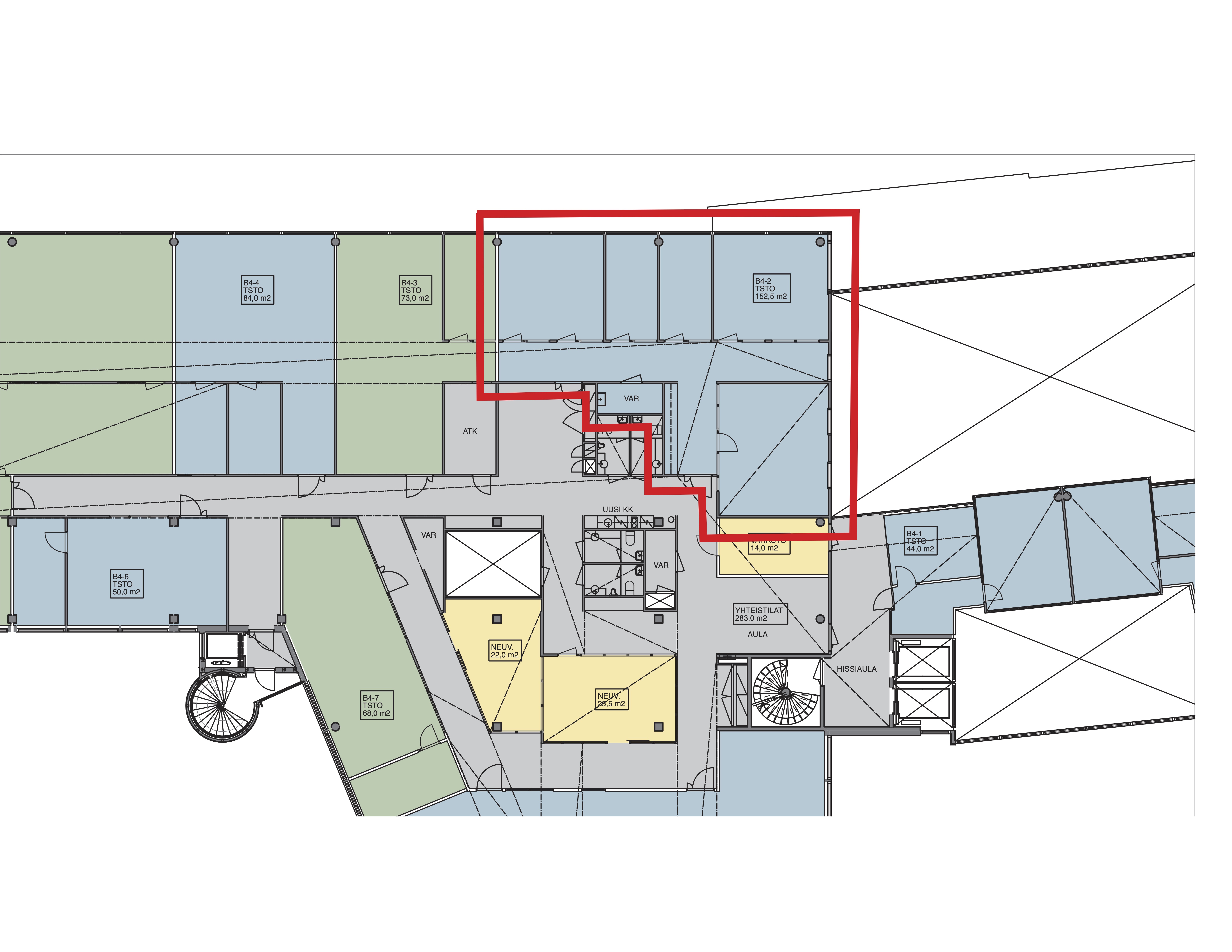 Toimistohuoneistojen pinta-alat vaihtelevat noin 40 neliön pientoimistoista 1 460 neliön koko kerroksen tiloihin. Huoneistot ovat muunneltavissa vuokralaisen työskentelytapaan sopivaksi. Sisäpihan toimistoista voi ihailla rauhoittavaa metsämaisemaa, kun taas Huopalahdentien puolen tiloissa voi kylpeä valossa. Kiinteistössä on myös erillisiä neuvottelutiloja.