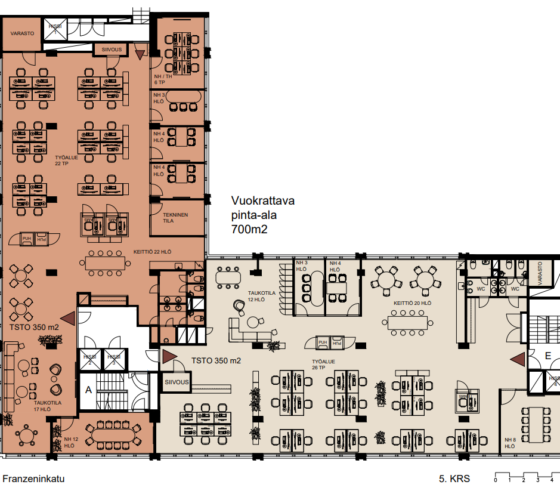 Viidennen kerroksen tilava ja moneen soveltuva 700 m², pääosin avotilasta koostuva toimisto.