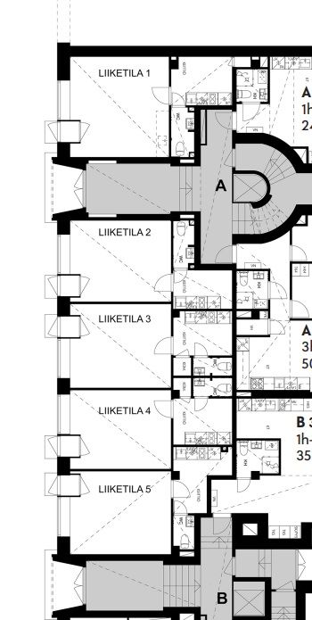 Taloyhtiön kivijalassa on 5kpl pieniä liiketiloja (27-33m2) ja yksi ravintolatila (208m2). Tämä liiketila sopii hyvin esim. parturille tai kampaamolle.