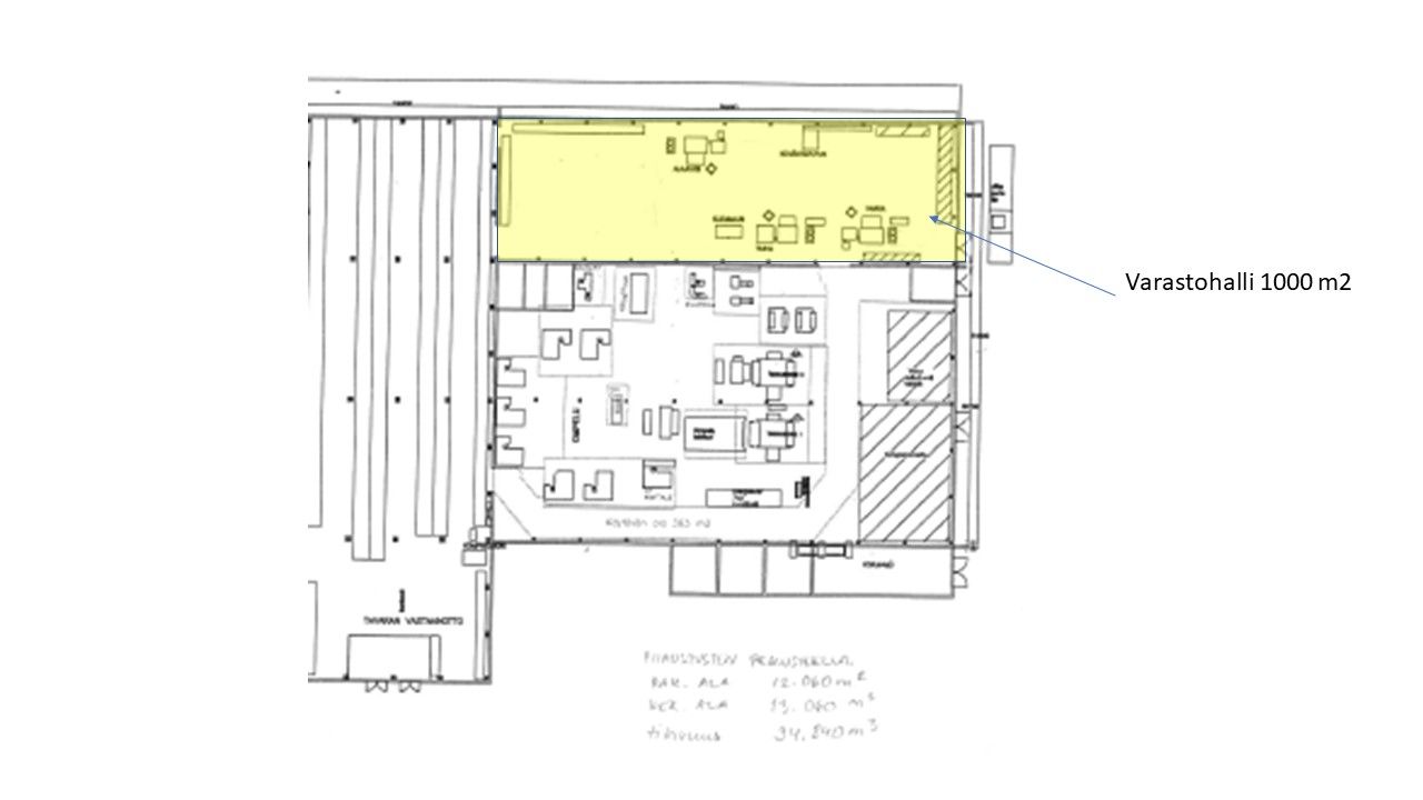Juuri vapautunut entinen metallipajana toiminut selkeä 1000 m2 noin 5,5 metriä korkea hallitila, jossa 1 lastaustasku. Pieni toimistotila varaston yhteydessä. Tila on yhdistettävissä 1500 m2 (korkeaan) ja 2000 m2 matalampaan (5,5 m) varastotilaan. Kiinteistössä on vuokrattavissa toimistotilaa. Kiinteistössä on sosiaalitilat. Pihalla on erittäin paljon pysäköintitilaa.