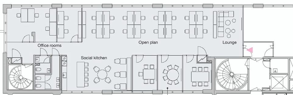 Toimisto koostuu avokonttoritilasta, useasta työ-/neuvottelutilasta, erillisestä keittiöllisestä taukotilasta sekä omista wc-tiloista. Tilaa on mahdollista muunnella vuokralaisen tarpeiden mukaan ja vuokralaisella on mahdollisuus vaikuttaa materiaalivalintoihin.