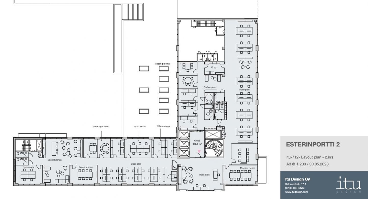 Toimisto koostuu puoliksi avokonttoritilasta ja työ-/neuvottelutiloista. Keittiölliset lounge alueet molemmissa siivissä sekä omista wc-tiloista. Ikkunat ovat Pasilankadun puolella. Tilaa on mahdollista muunnella vuokralaisen tarpeiden mukaan.