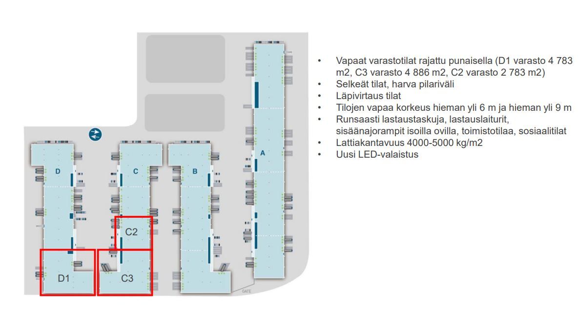 Tilaan lastaustaskuja, sekä sisäänajorampit lattiakantavuus 5000 kg/m2. Isot piha-alueet. Varasto pohjakuvassa D1 Vuosaaren Logistiikkakeskus on osa vuonna 2008 valmistunutta modernia ja nykyaikaista sataman logistiikka-aluetta.