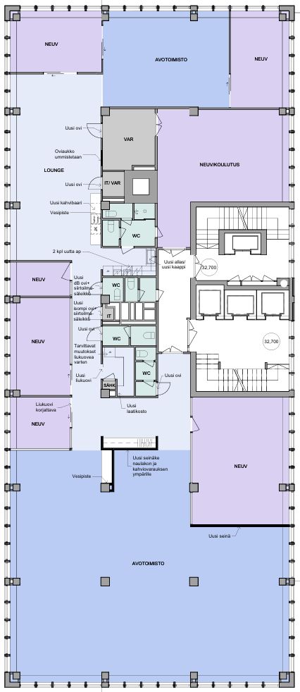Lounge ja avotilaa: Joustava ja avara tila, joka mahdollistaa monipuoliset työskentelyratkaisut ja mukavat taukopaikat