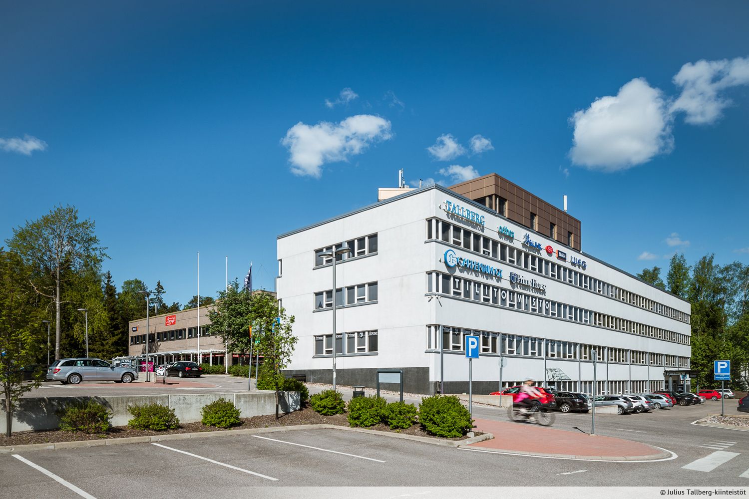 Rakennuksen edessä on runsaasti pysäköintitilaa.