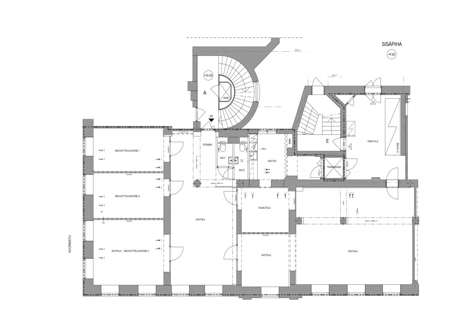 Toimistosta löytyy kolmen tilavan työ-/neuvotteluhuoneen lisäksi hyvin akustoitua avotilaa, varastohuone, taukotila, keittiö, ja kaksi wc-tilaa.