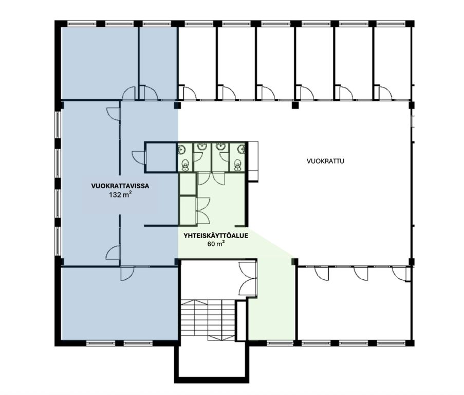 Tämä 132 m² toimistotila sijaitsee kiinteistön 3. kerroksessa. Toimistossa on huoneita sekä oma keittiö. Lisäksi tilaan tulee 30 m² jyvitys yhteiskäyttöisistä tiloista. Tilaan ei ole hissiyhteyttä. Vuokrattavana myös pientä varastotilaa.