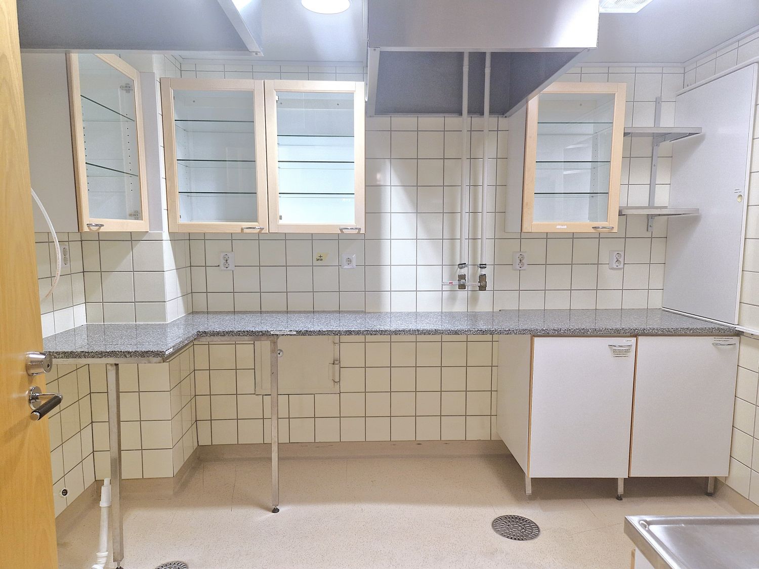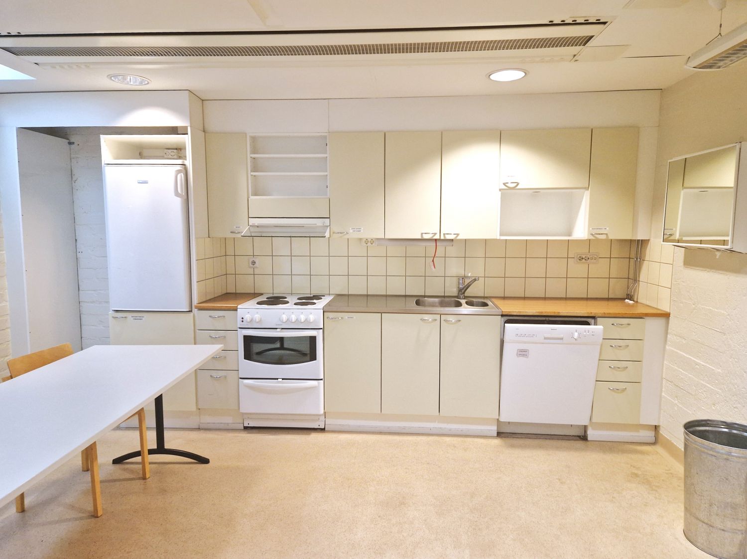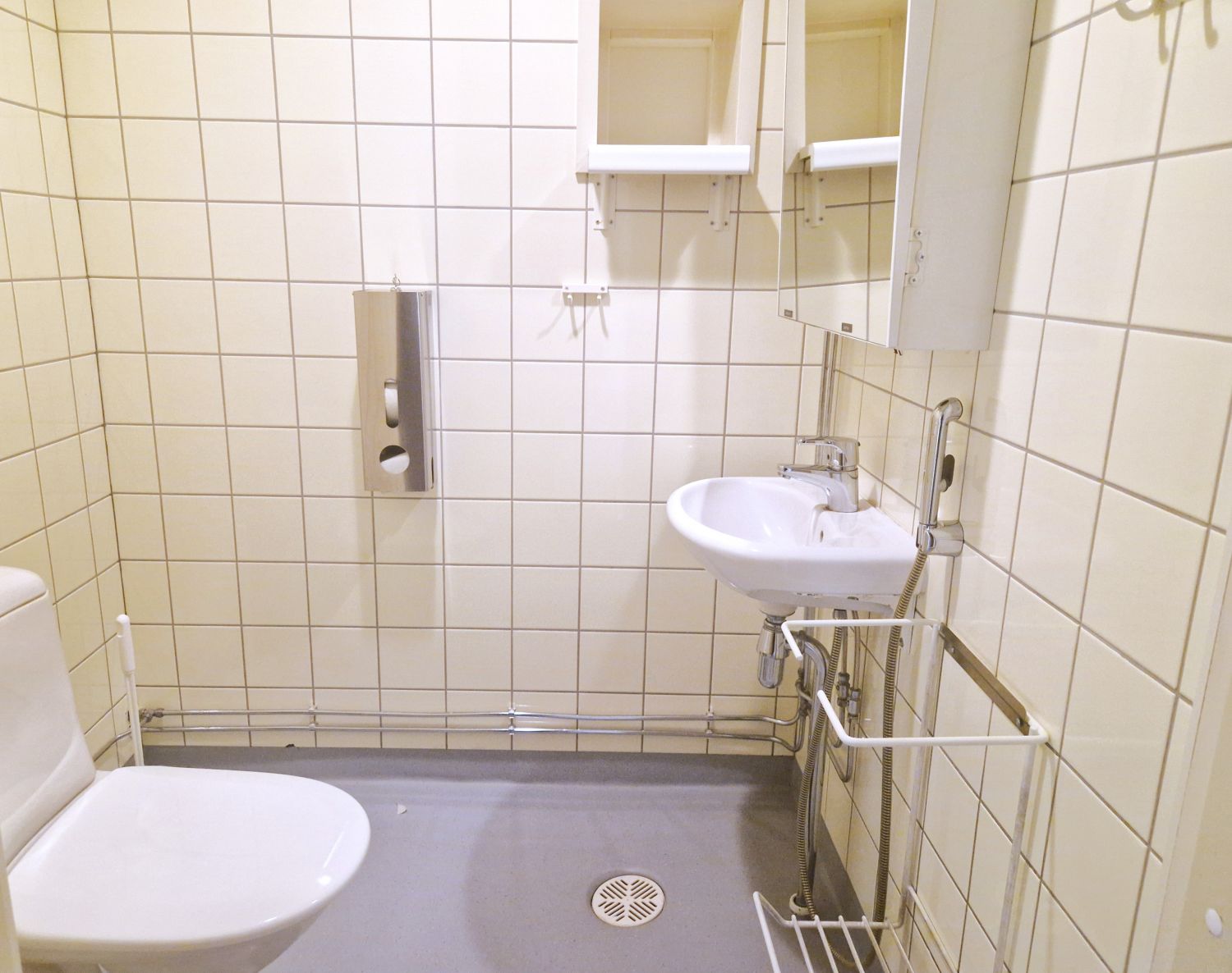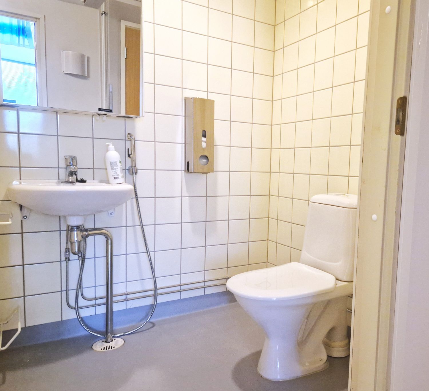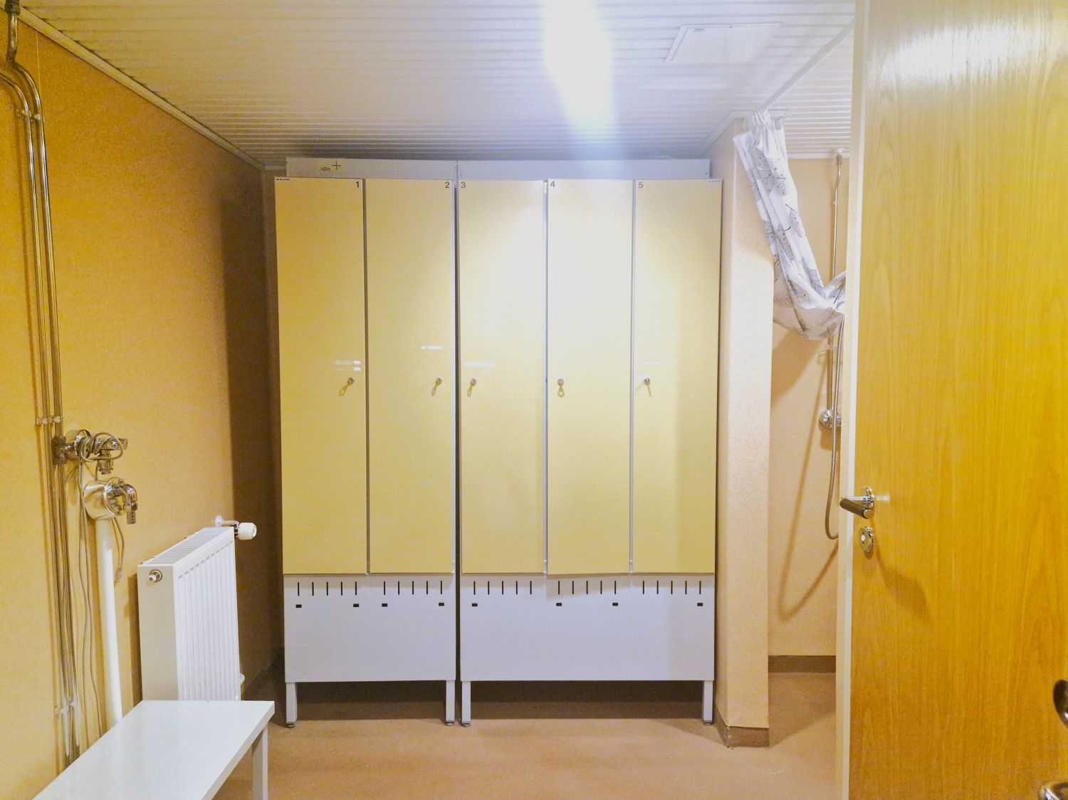 1. kerroksessa on yhteiset wc:t käytävällä, keittiötila sekä pukuhuoneet löytyvät kellarikerroksesta.