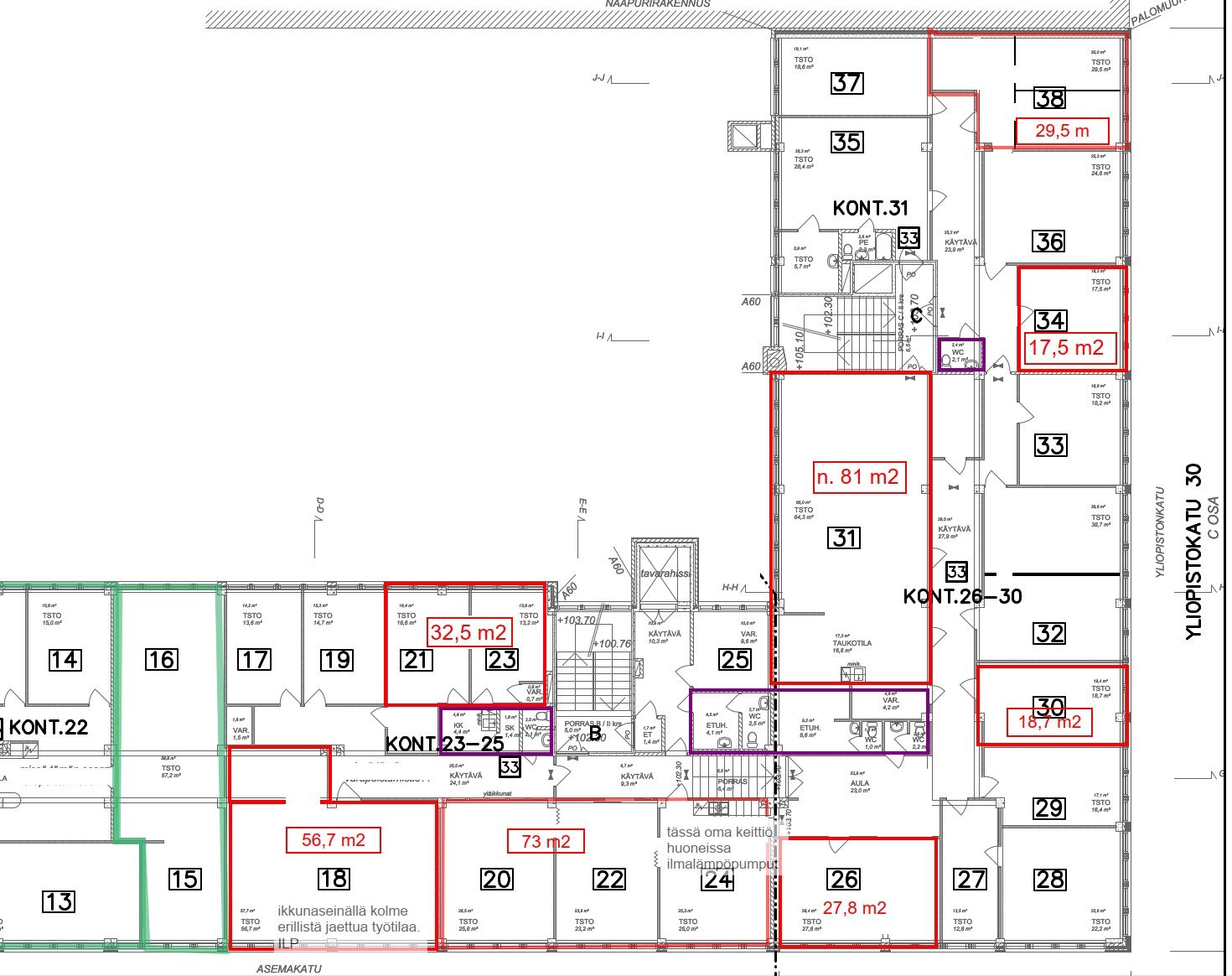 Sik-Lan kulman vapaiden tilojen koot vaihtelevat noin 15 - 81 m2 välillä. Tilojen käyttäjillä on yhteiskäyttöiset wc- ja keittiötilat. Ota yhteyttä näyttöä varten!