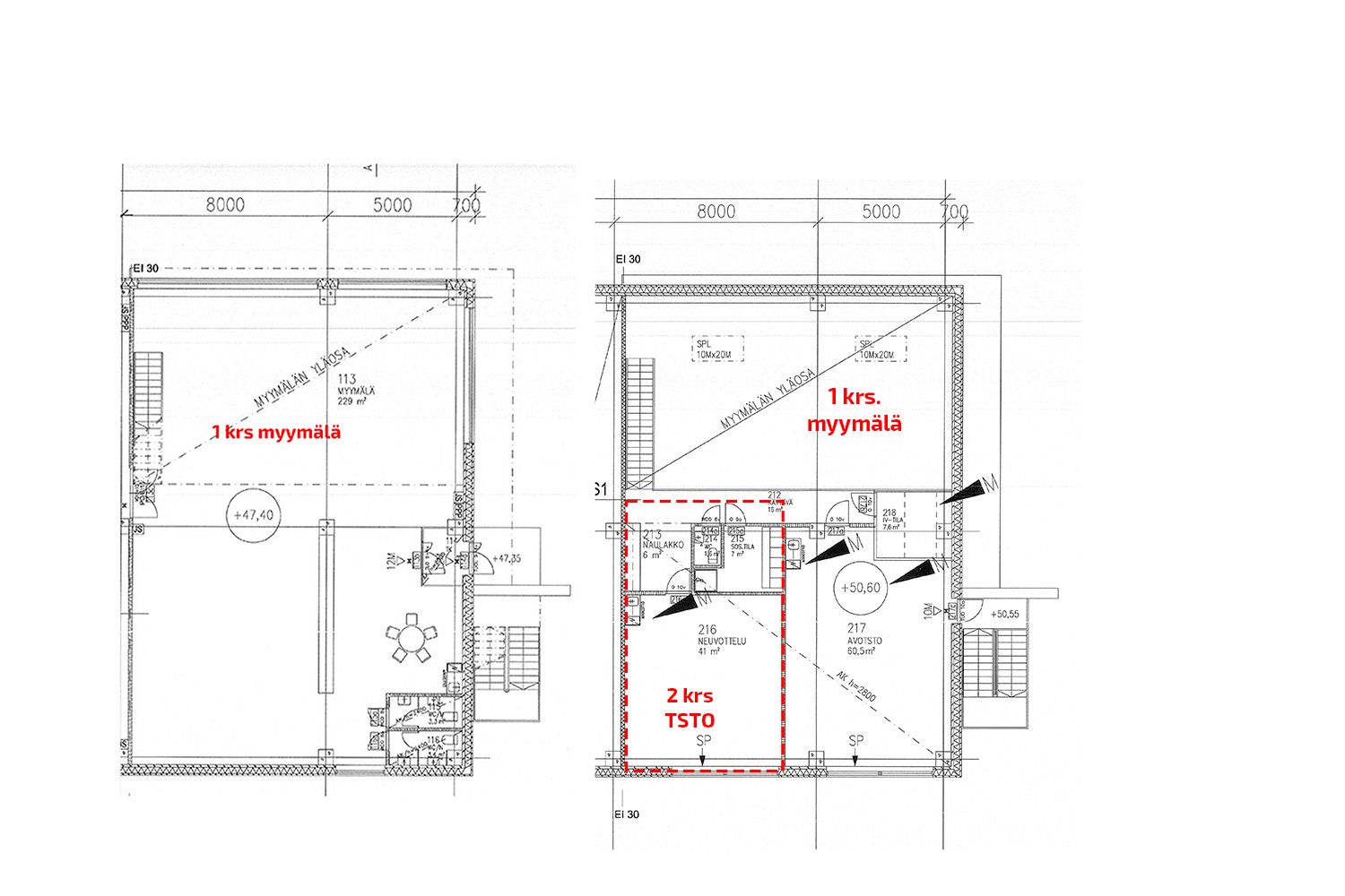 Myymälä on hyväkuntoinen ja valoisa 240 m², jossa isot ikkunat ja täten hyvä näkyvyys! Pohjakuvaan myymälän ja toimiston tila merkittynä punaisella katkoviivalla. Takaosasta löytyy lisäksi wc-tila ja vesipiste. Myymälätilan yläpuolella lisäksi toimistotilaa noin 41 m². Toimiston yhteydessä minikeittiö, suihku ja wc-tilat (yhteensä yläkerran vuokrattava alue on noin 82 m²). Myymälän vieressä korkea varastohallitila pinta-alaltaan 84 m² (pohjakuvassa vihreällä katkoviivalla). Hallin korkeus vaihtelee 6-8 metrin välillä ja tilan leveys on 4,5 metriä sekä pituus 18,5 metriä. Hallitila on läpiajettava ja nosto-ovien koko on L3,5 m x K 4,5 m. Hallista lisäksi sisäkautta kulku myymälätilaan (isot pariovet). Halli soveltuu hyvin moneen varastointiin eikä siellä ole vesipistettä eikä lattiakaivoja.