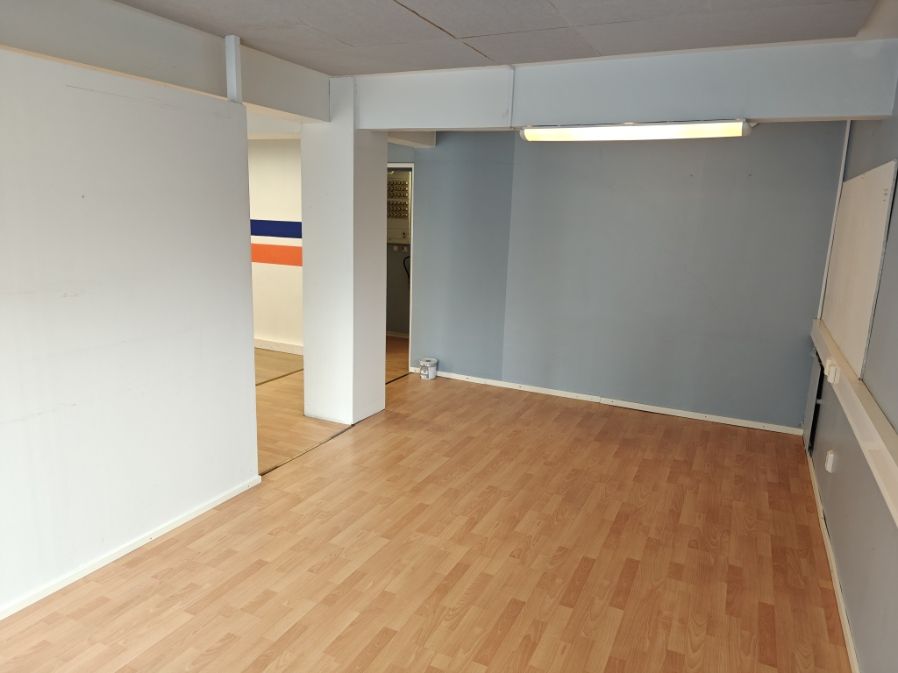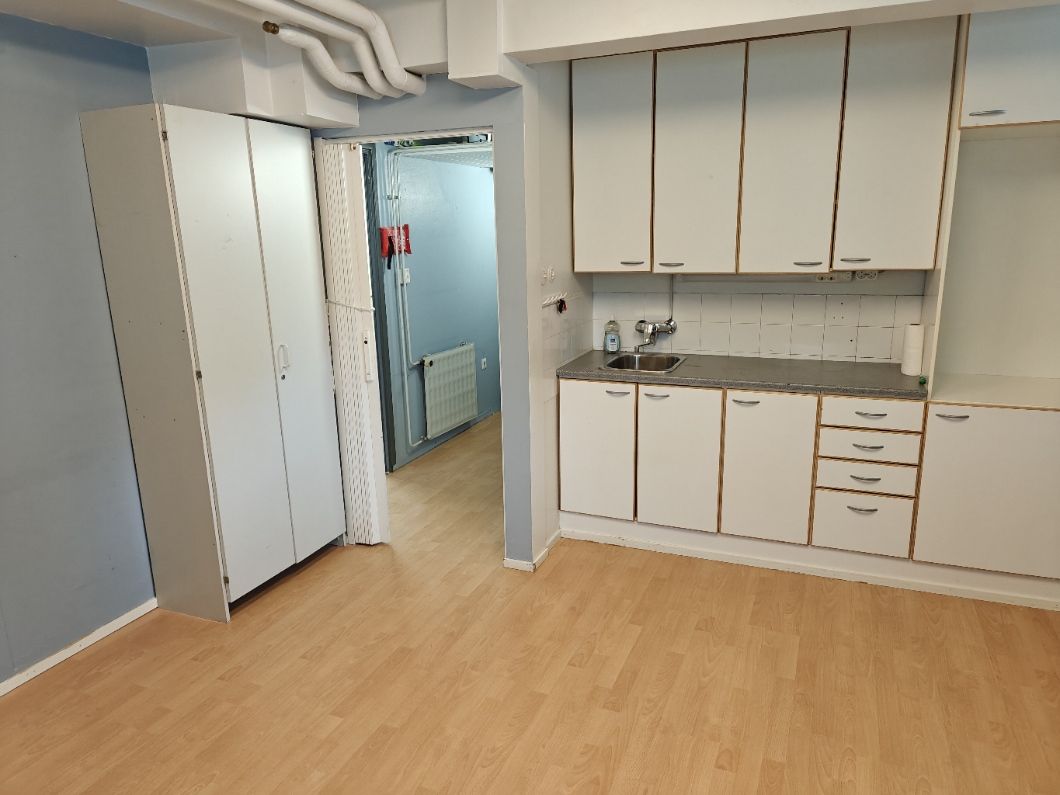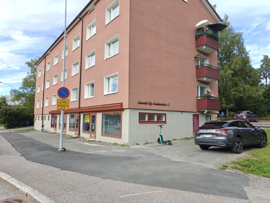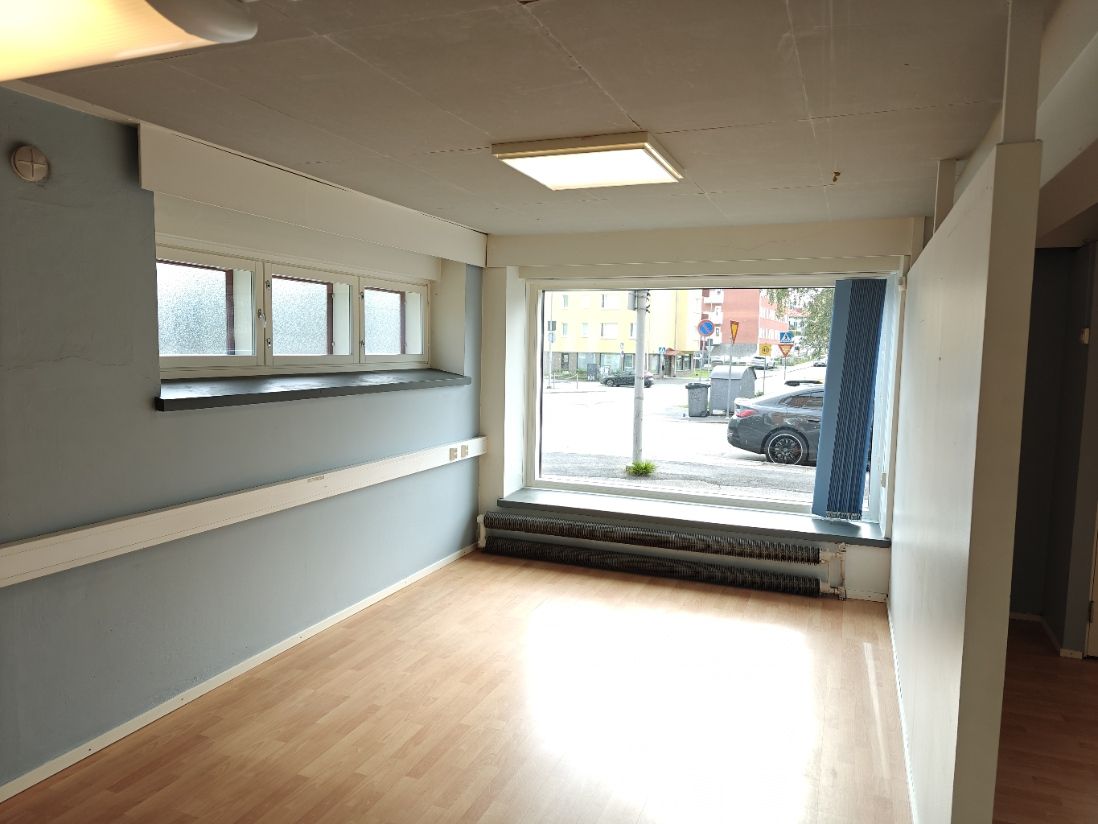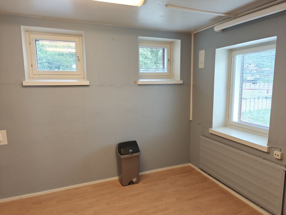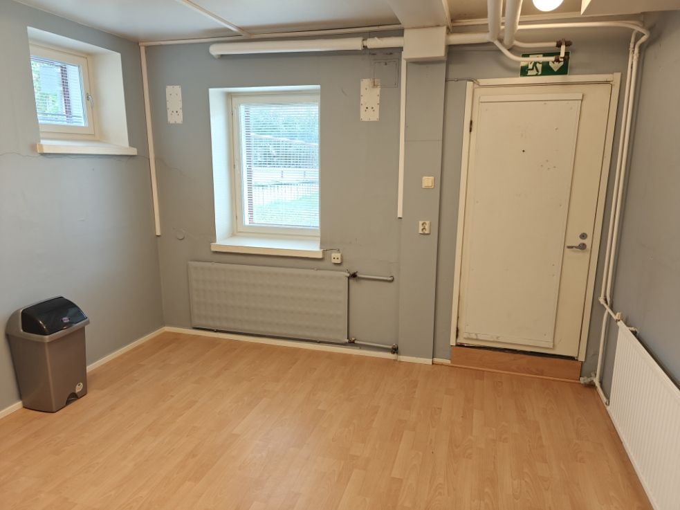 Pienkerrostalon pohjakerroksessa liiketila, jossa muutama huone ja hyvin varasto- ja sosiaalitilaa, wc.