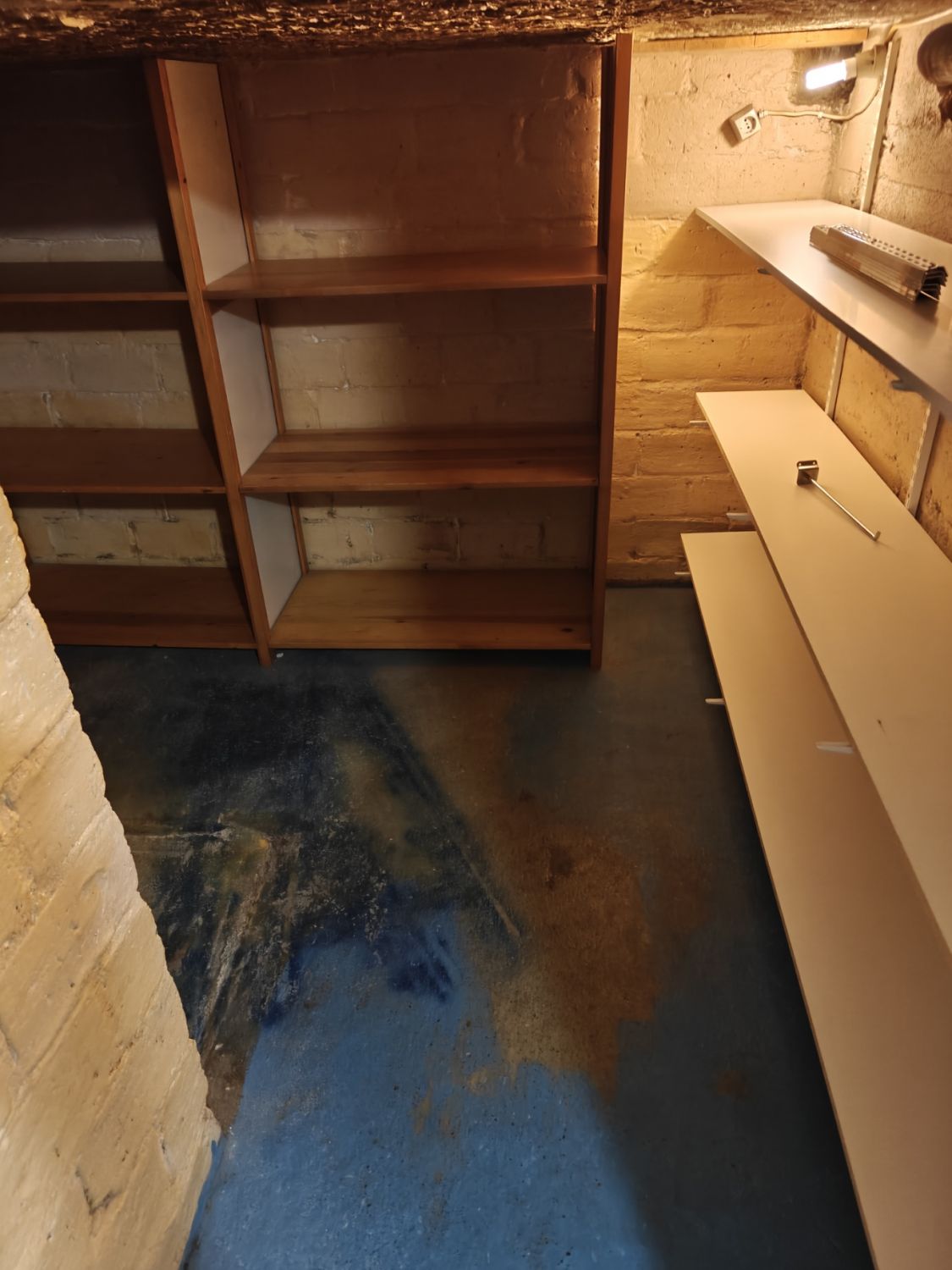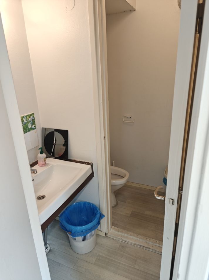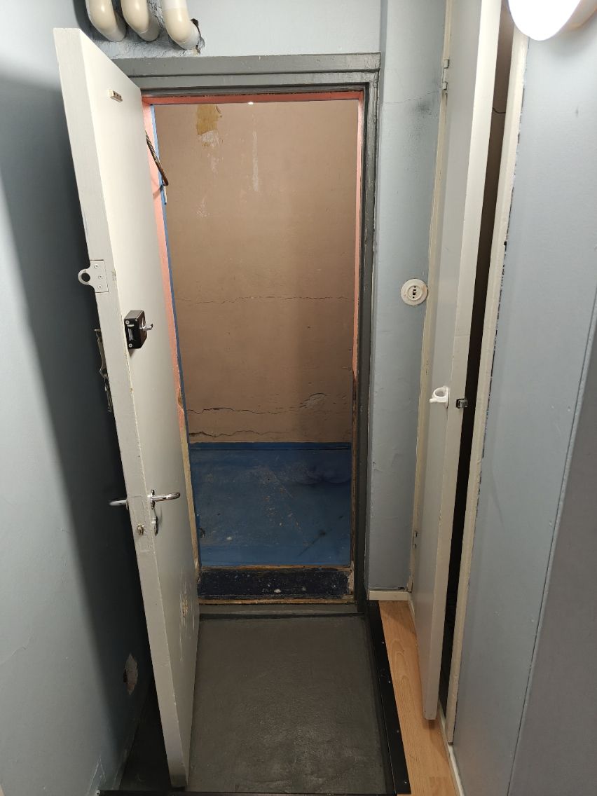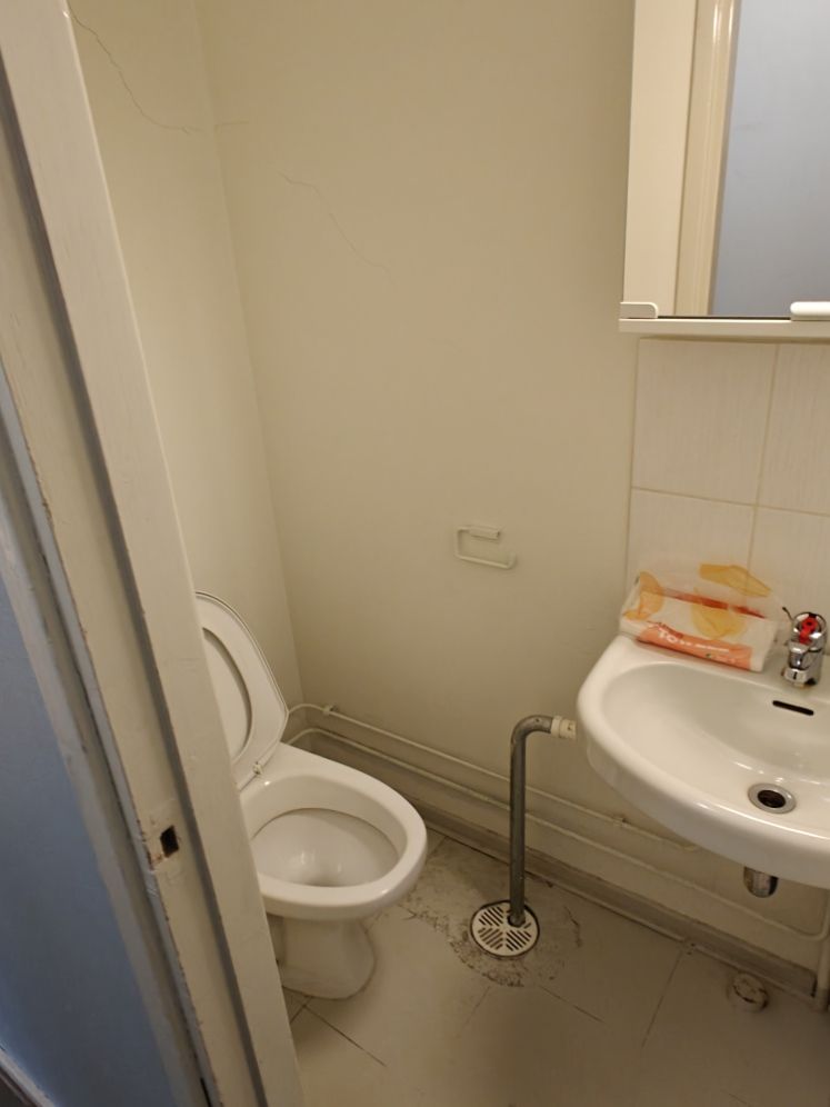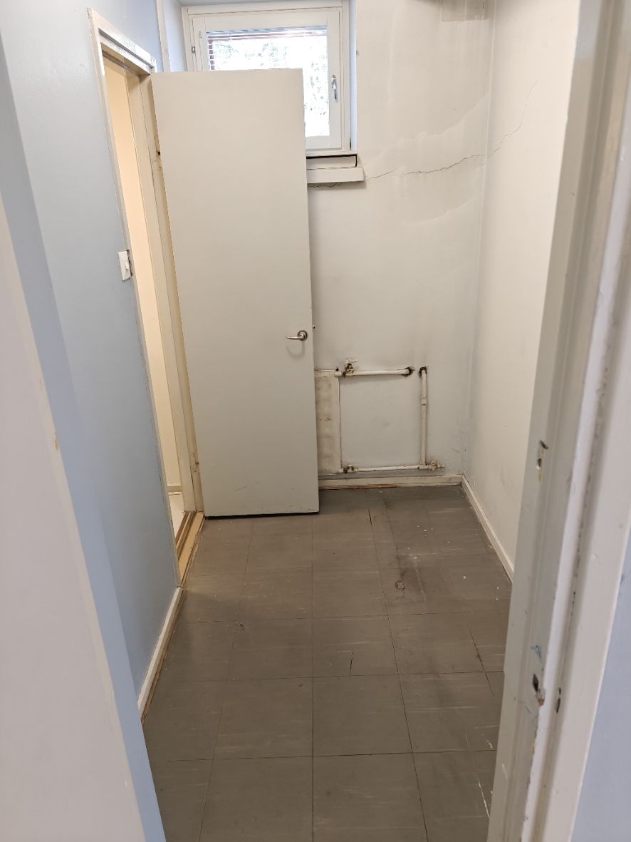 Pienkerrostalon pohjakerroksessa liiketila, jossa muutama huone ja hyvin varasto- ja sosiaalitilaa, wc.
