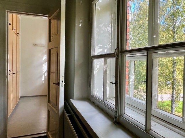 Tilan kahdestasuuresta ikkunasta avautuu kaunis näkymä pihan puoleiselle puutarhapihalle. Tilassa pieni ovellinen erillishuone jossa säilytyskaapit. Tunnelman kruunaa alkuperäinen lautalattia ja yli 3 m huonekorkeus.