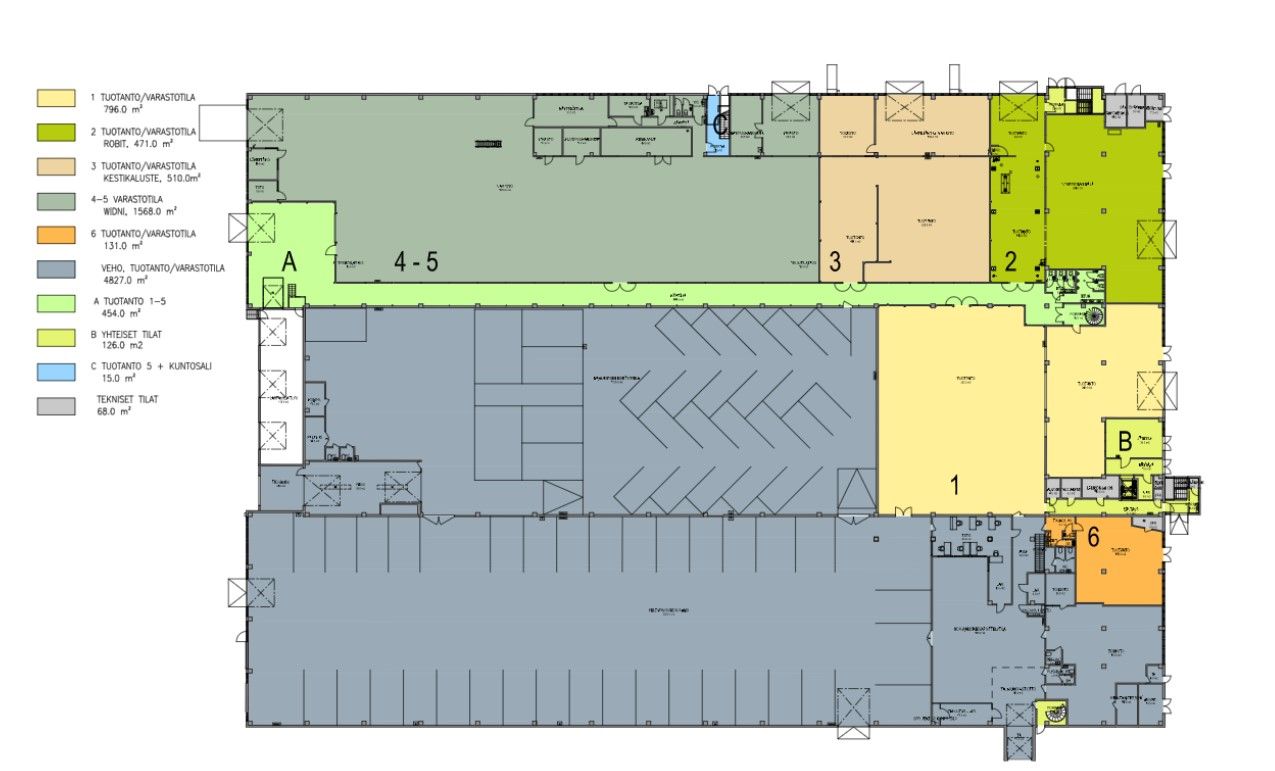 Kiinteistön toiminnalliset varasto/tuotantotilat sijaitsevat ensimmäisessä kerroksessa, ne on jaettu viiteen eri osaan. Kaikille käyttäjille yhteiset sosiaali sekä taukotilat sijaitsevat toisessa kerroksessa. Toiseen kerrokseen tulee myös toimistotiloja sekä kaikille yhteisiä neuvottelutiloja. Kolmanteen kerrokseen tulee lisää toimistotiloja sekä henkilöstöravintola. Kiinteistön toimisto ja varasto/tuotantotiloja voi vuokrata yhdessä, tai erikseen, tarpeen mukaan. Kiinteistön kokonaispinta-ala on noin 12 000 neliöitä sekä kokonaistilavuus on yli 80 000 kuutiota.