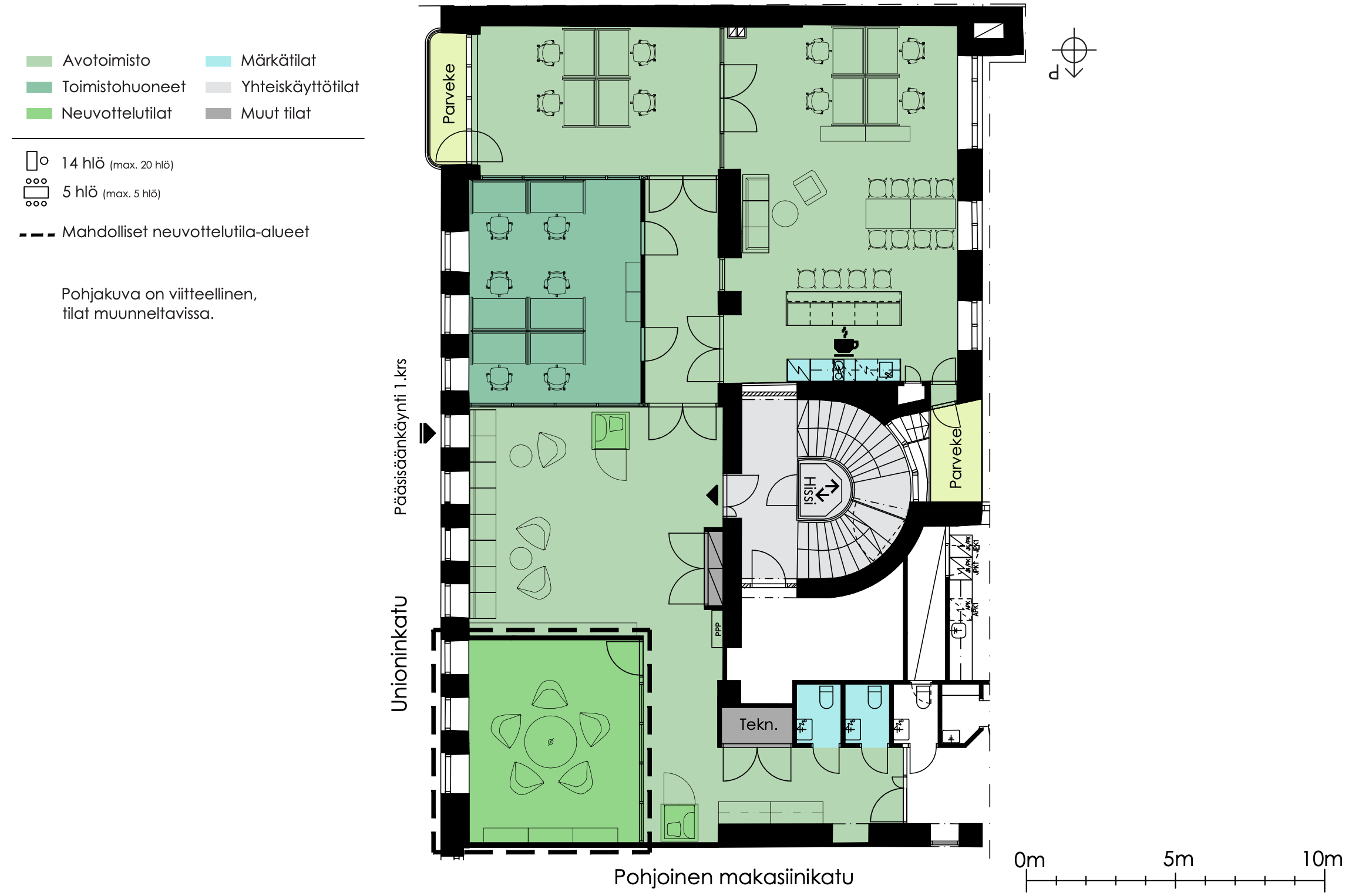 Tämä Unioninkadun toimisto- ja liiketilakiinteistö sijaitsee Kaartinkaupungissa. Lyhyen kävelymatkan päässä on useita ravintoloita ja hotelleja, jotka sopivat vaativaankin makuun. Aivan vieressä on muitakin keskustan helmiä, kuten Vanha kauppahalli ja Tähtitorninmäen sekä Esplanadin puistot. Kaartinkaupunki on uuden ja vanhan viehättävä sekoitus. Keskellä Helsinkiä, mutta omassa rauhassaan.