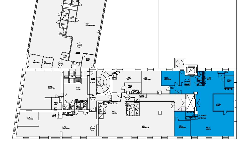 Valoisa vanhan puolen tila, jossa tunnelmalliset ristikko ikkunnat. Pinnat kunnostetaan uuden käyttäjän tarpeiden mukaisesti. Tilaan pääsee tavarahissillä.