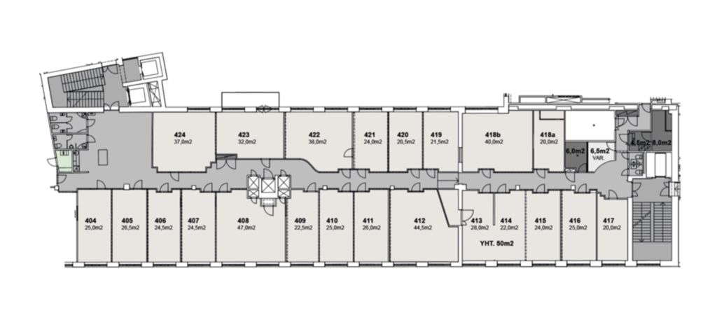 Vuokrattavana 20 m² - 60 m² kokoisia pientoimistotiloja kiinteistön 4. kerroksesta, pientoimistoalueelta. Vuokralaisten käytössä on kaikki talon monipuoliset palvelut: aula- ja ravintolapalvelut, monipuoliset kokoustilat sekä postituspalvelut. Vuokraan sisältyy WLAN, kahvia ja teetä kerroksen yhteiskeittiössä, siivous kerran viikossa, aulapalvelu ja sähkö. Kuvat ovat yleiskuvia kiinteistön tiloista.