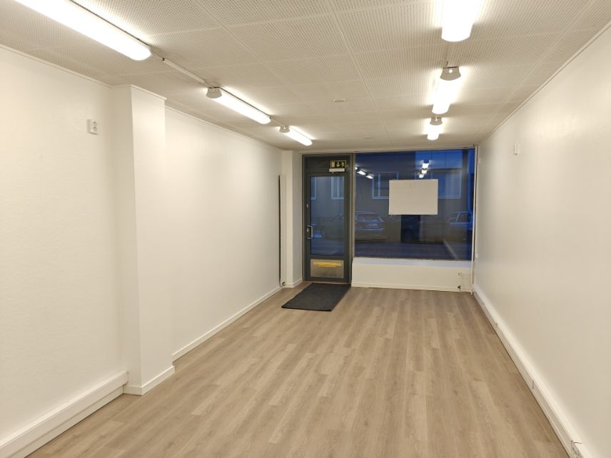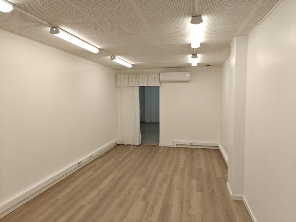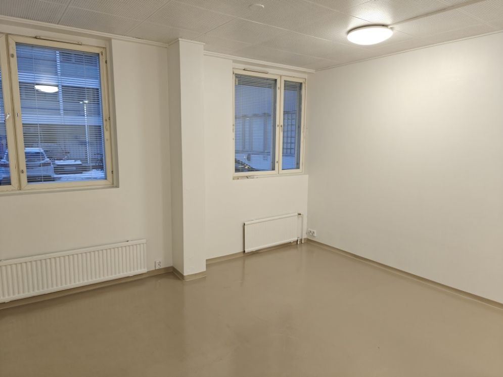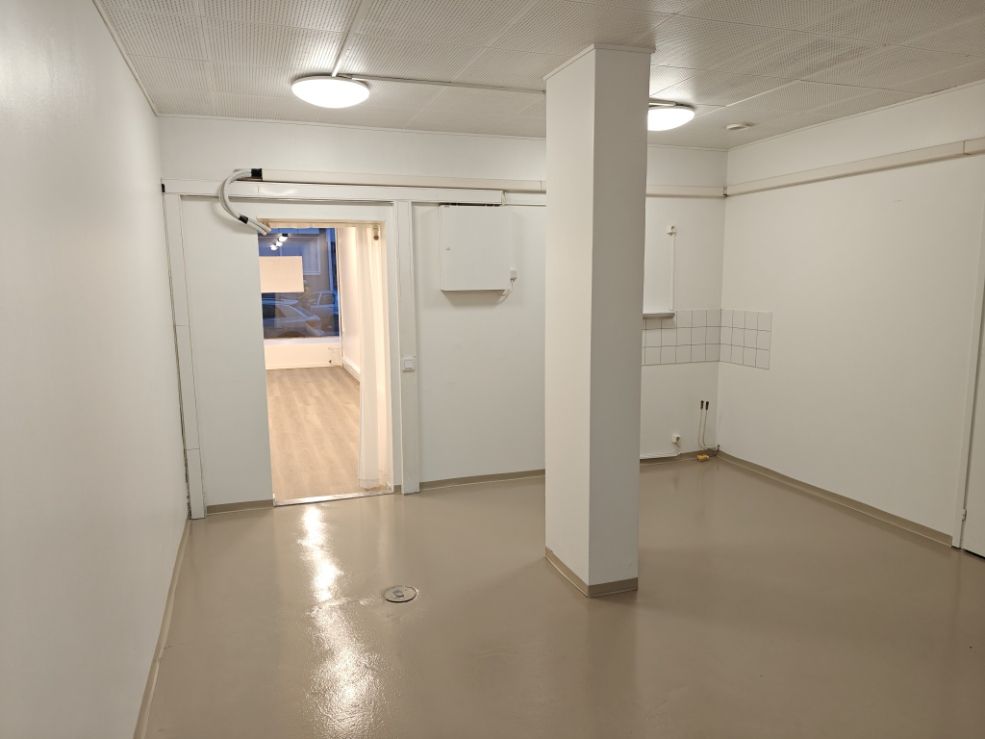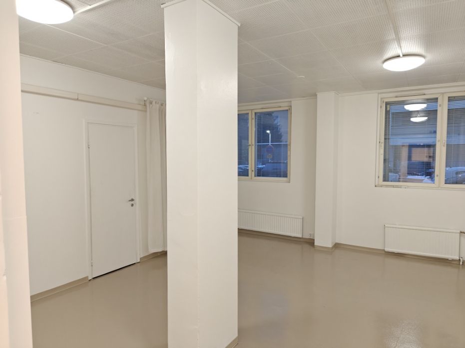 Liiketila, jossa etuosassa pitkänomainen liiketila, takaosassa kaksi wc:tä ja iso huone, ikkuna ja ovi sisäpihalle.