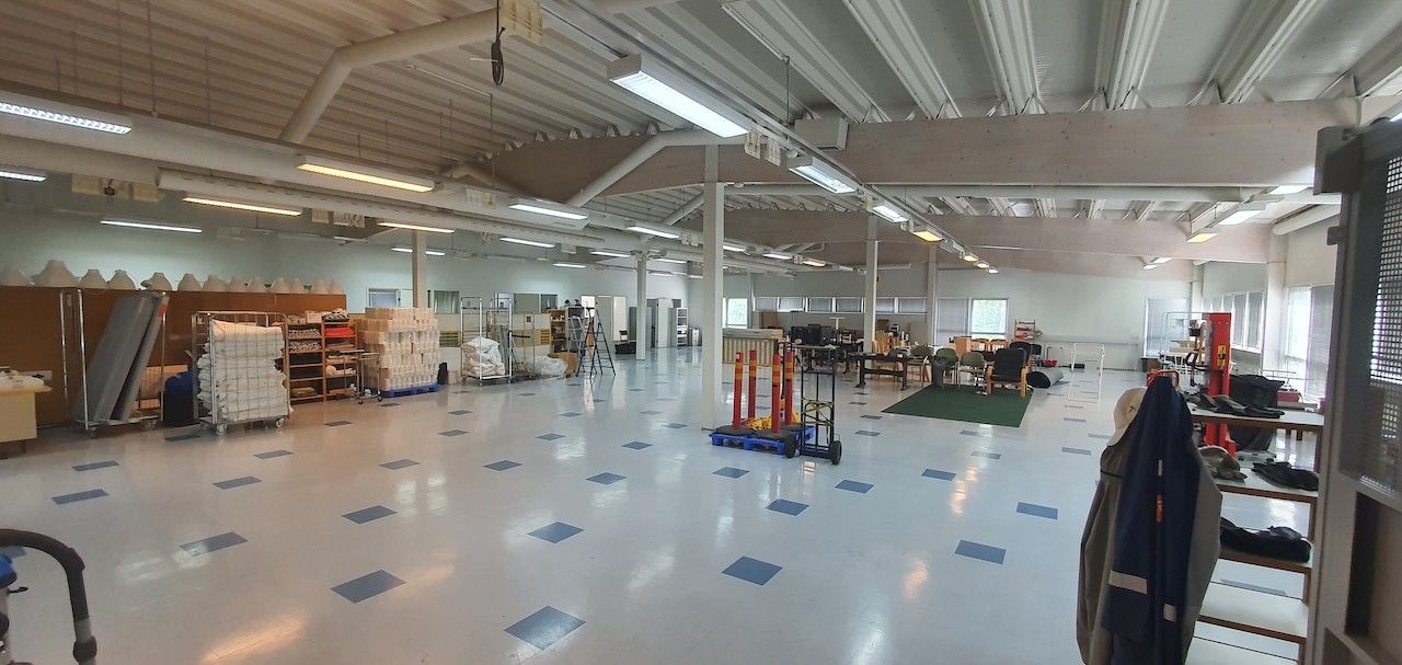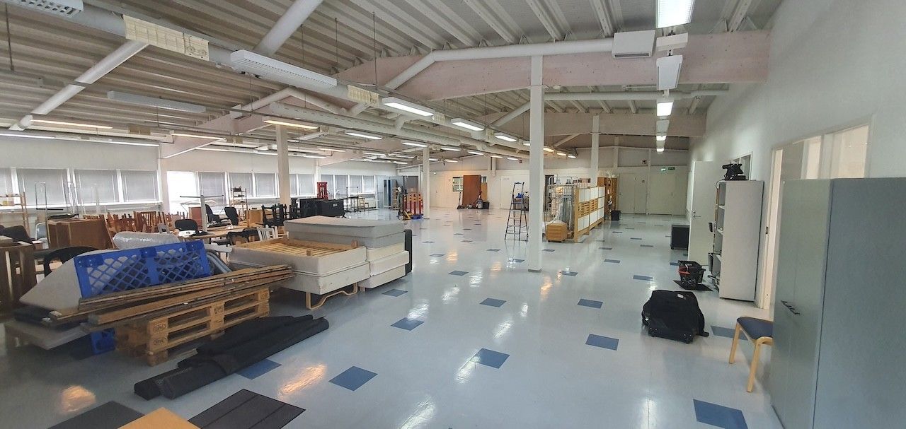 Rakennuksen metallirunko antaa poikkeuksellisen joustavuuden sisätilojen muokkaamiseen. Tilat ovat muutettavissa tarvittaessa avoimeksi tilaratkaisuksi. Ensimmäisessä kerroksessa (noin 1 030 m²) on tällä hetkellä kevyillä väliseinillä jaettuja majoitushuoneita, ja sen huonekorkeus on 3,2 metriä, mikä mahdollistaa monipuolisen käytön. Toisessa kerroksessa (noin 1 000 m²) on pääosin WC-, pesu-, keittiö- ja sosiaalitiloja sekä avointa varastotilaa. Ullakkokerroksessa (noin 40 m²) sijaitsee neuvotteluaula ja ilmanvaihtokonehuone. Tavarahissi (kantavuus 1 000 kg) helpottaa toiseen kerrokseen kuljetusta.