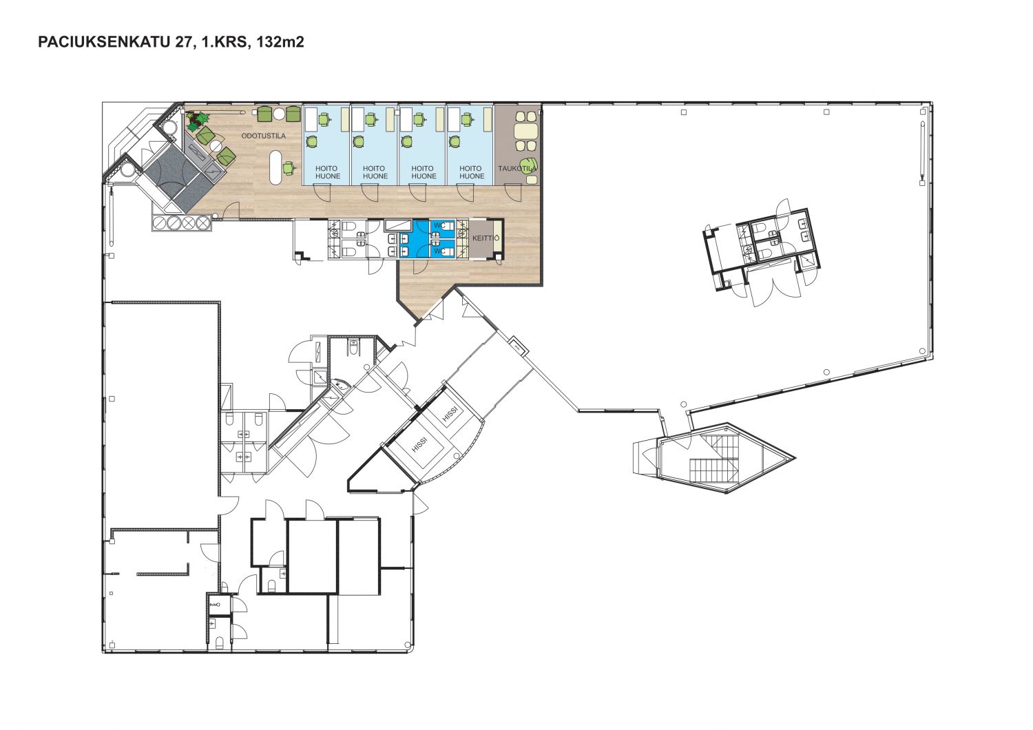 Meilahden Paciuksenkadulta on vapautumassa katutasosta 132 m² liiketilaa, joka soveltuu mainiosti esimerkiksi fysioterapiakäyttöön, hierojalle tai vaikkapa kauneushoitolaksi. Liiketila joustaa pienemmän tai isomman toimijan käyttöön, sillä kyseistä tilaa on mahdollista yhdistää myös viereisten tilojen kanssa jopa 523 m² kokonaisuudeksi. Tilat remontoidaan vuokralaisen tarpeiden mukaan.