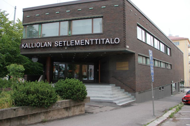 Valoisa avotoimisto näkyvällä ja keskeisellä paikalla Kalliolan Setlementtitalosta vilkasliikenteisen Sturenkadun varrella.