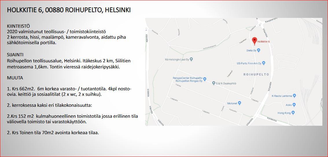 Osoite: Holkkitie 6, 00880 Helsinki. Teollisuus- ja varastokiinteistö on valmistunut 2020. Kiinteistössä on 2 kerrosta, hissi, maalämpö, kameravalvonta, aidattu asfaltoitut piha, sähkötoimisella portti. Sijaitsee Roihupellon teollisuusalueella. Itäkeskus 2 km, Siilitien metroasema 1,6km. Tontin vieressä raidejokeripysäkki.
