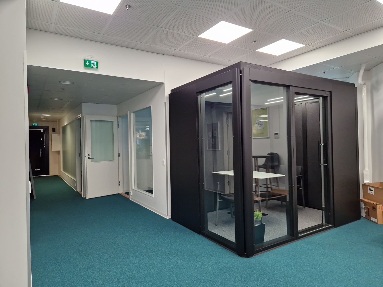 Kuvassa näkyvä musta irrallinen neuvottelutila on nykyisen vuokralaisen ja ei sisälly vuokrattavaan tilaan.
