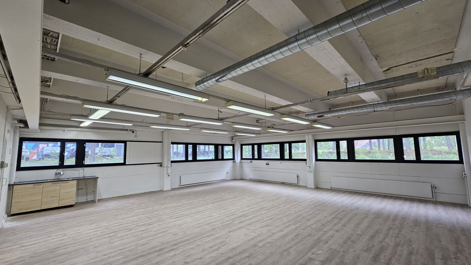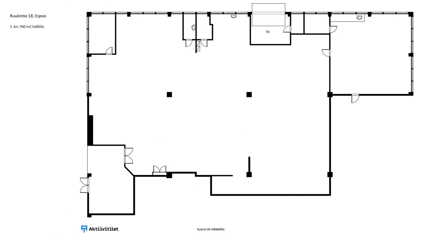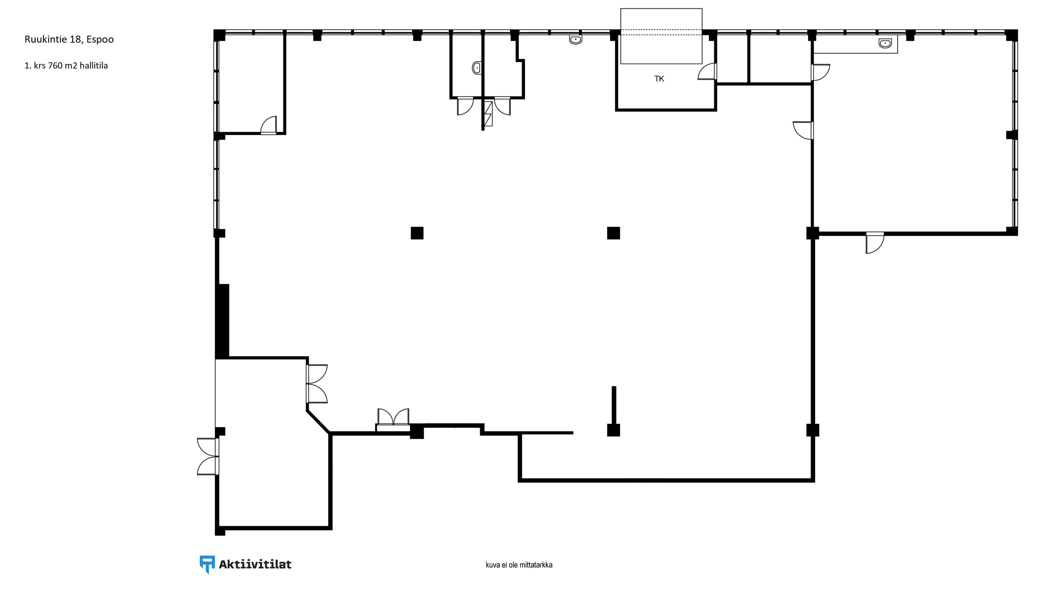 Hallin lattia on kulunut ja materiaali vaihtelee alueittain. Muuten tila on perussiisti. Valaistus ledeillä. Vuokranantaja uusii tilan lattiapinnoitteen ja on valmis remontoimaan tiloja muutenkin vastaamaan vuokralaisen tarpeita.