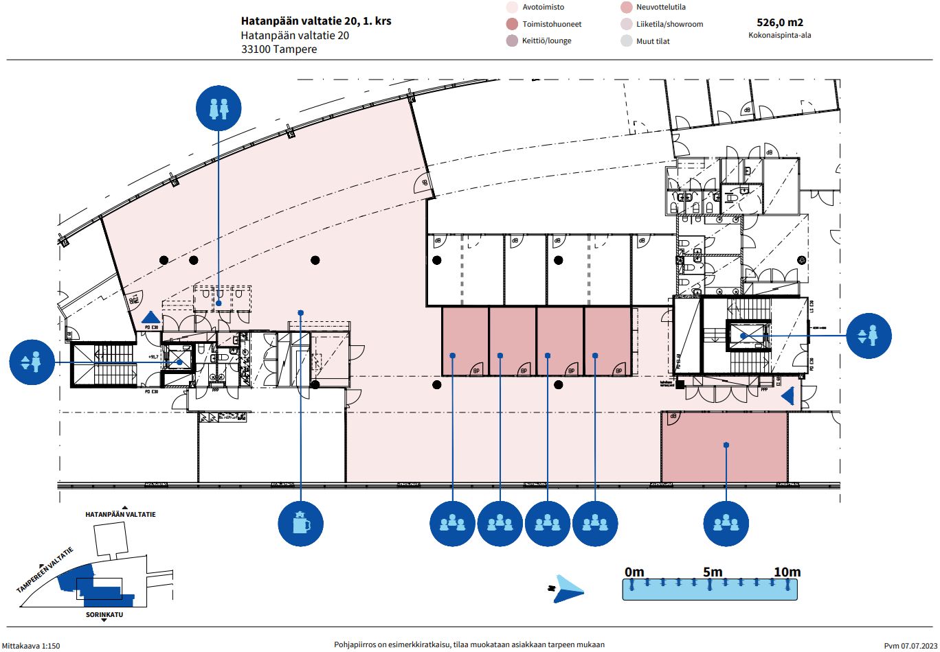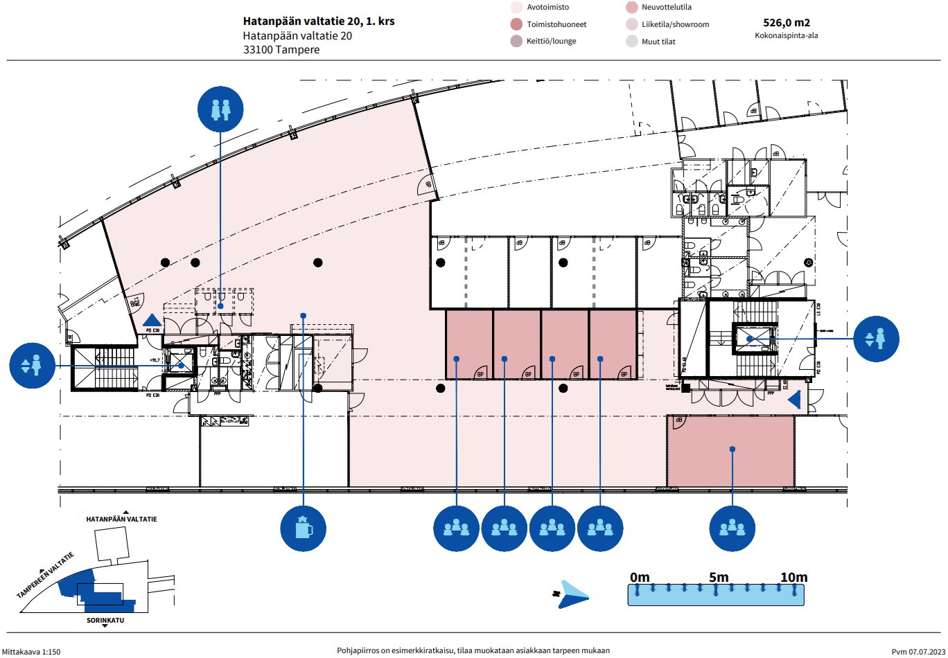 Siisti ja valoisa 526 m² toimistotila sijaitsee kiinteistön 1. kerroksessa erinomaisella paikalla Tampereen keskustassa. Kyseessä on läpitalon toimistotila, jossa on runsaasti ikkunoita kahteen suuntaan, mikä tuo tilaan miellyttävää luonnonvaloa koko päivän ajan. Pohjaratkaisussa on tällä hetkellä avotilaa sekä käytännöllisiä neuvottelu- ja työhuoneita, ja oma taukokeittiö lisää arjen toimivuutta ja viihtyvyyttä.