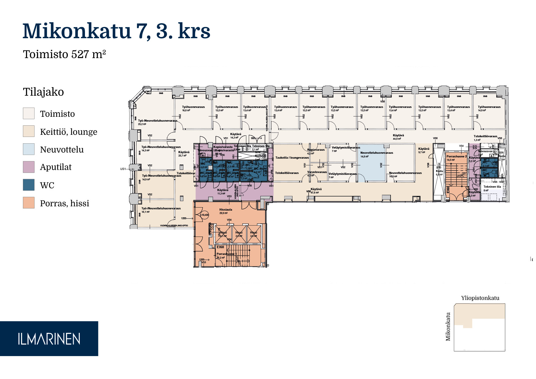 Vuokrattava toimistotila 527 m², näyttävässä ja täysin peruskorjatussa kiinteistössä loistosijainnilla ja kattavilla palveluilla. Mahdollista vuokrata myös viereinen tila samasta kerroksesta, jolloin toimistotilaa on yhteensä 885 m2.