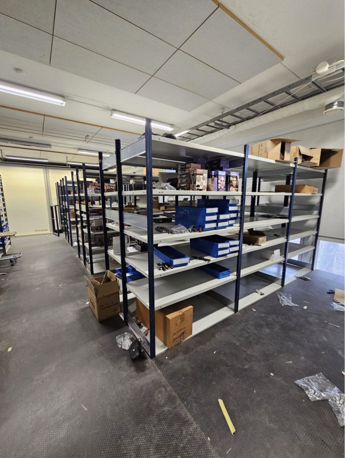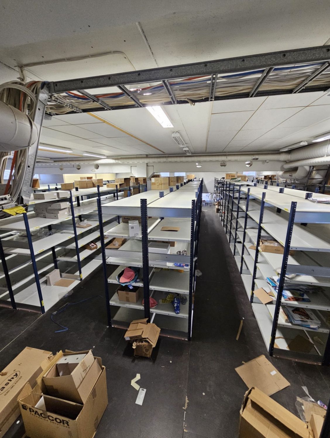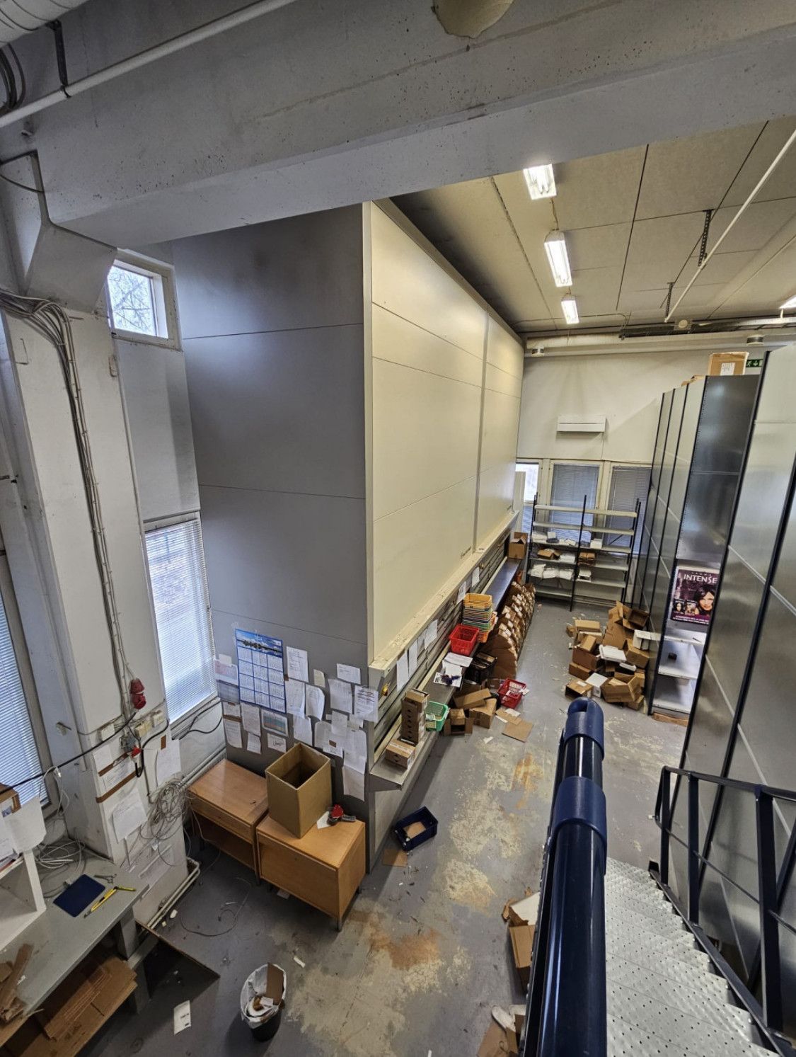 Tila sijaitsee hallin alimmassa lohkossa (pohjakuva). Kokonaisuudessaan 256 m2 varasto tarjoaa korkeutta, jota on hyödynnetty rakentamalla noin 3 metrin korkeudelle sijoittuva parvikerros. Parven alla on vielä 2,5 metrin korkuista käyttötilaa. Pientavarahyllyjen kanssa kokonaiskäyttöala nousee lähes 400 m2:iin – poikkeuksellisen monipuolinen ja tehokas ratkaisu.