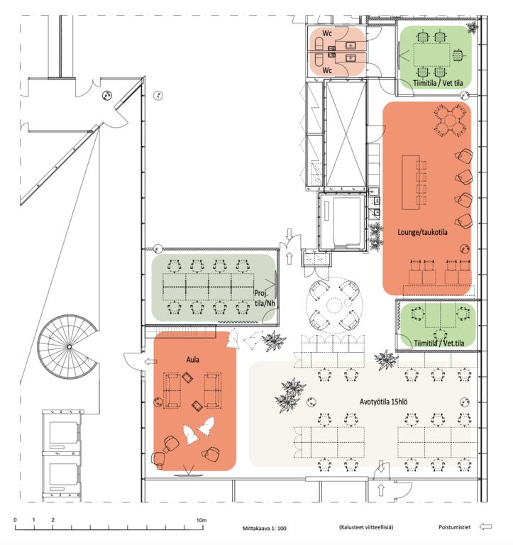 Tämä 291 m² tila sijaitsee kiinteistön 5. kerroksessa, ja se kuuluu Aina Valmis-konseptin tiloihin. Toimistossa on avotilaa, neuvotteluhuoneita, työhuone, lounge-/taukotila sekä omat wc-tilat. Tila on suunniteltu ja remontoitu valmiiksi laadukkaita ja kestäviä materiaaleja käyttäen. Avaimet saa käteen vaikka heti seuraavana päivänä. Aina Valmis-toimistotilojen hiilijalanjälki on tehty mahdollisimman pieneksi ja remontit on toteutettu vastuullisesti. Kuvat ovat havainne- ja yleiskuvia kiinteistön tiloista.