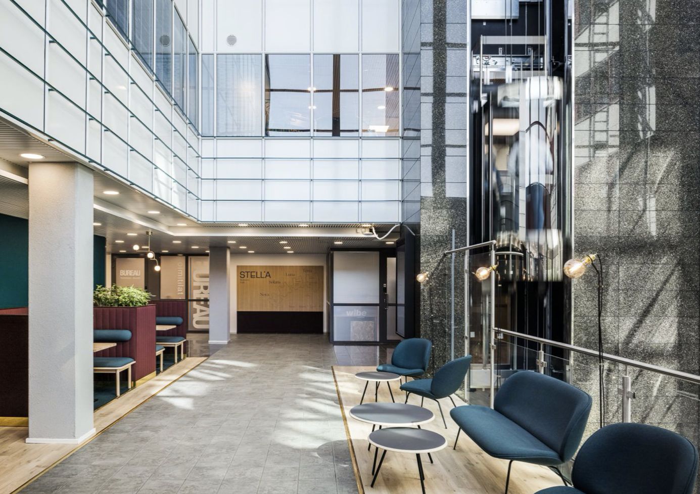 Stellasta löytyvät mm. aulapalvelu, vuokrattavia neuvottelutiloja, auditorio, kaksi lounasravintolaa, kampaamo, kuntosali, saunaosasto, varatotilaa, autopesula sekä pihalla lastaustila. Ohessa havainnollistavia kuvia Stellan tiloista.