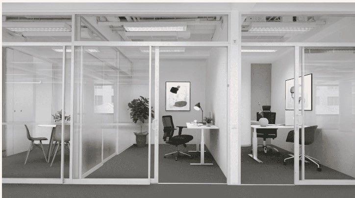 Viidennen kerroksen avotoimisto yhdellä isolla neuvotteluhuoneella B-rapussa.