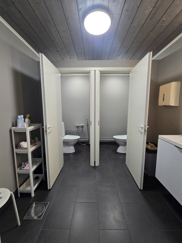 Käytössä on yhteiskäyttöiset, siistit wc-tilat käytävällä.