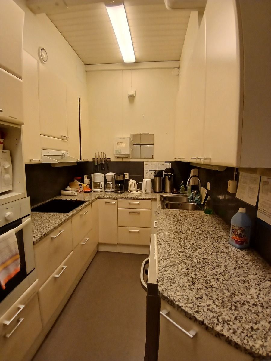 Keittiössä kaksi isoa jääkaappia ja pakastinkaappi. Astianpesukone, kaksi uunia, liesitaso, liesituuletin ja mikro. Kaapistot sekä keittiössä, että kahvilatilassa sekä kahvilatilassa juomakaappi.