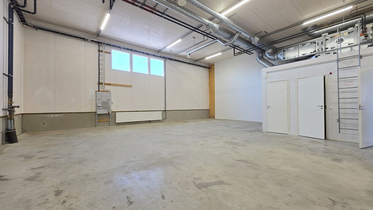 Kaikkiaan noin 150 m²:n tilassa on nosto-ovi (L 3 m x K 4,5 m), erillinen käyntiovi sekä lattiakaivo. Ison hallin lisäksi tiloissa on suihku ja wc, erillinen siivouskomero sekä toimistohuone ja neuvotteluhuone, jonka yhteydessä on minikeittiö. Toimistotilojen päällä on vielä lisäsäilytysparvi. Vapaata korkeutta hallissa on noin viisi metriä.