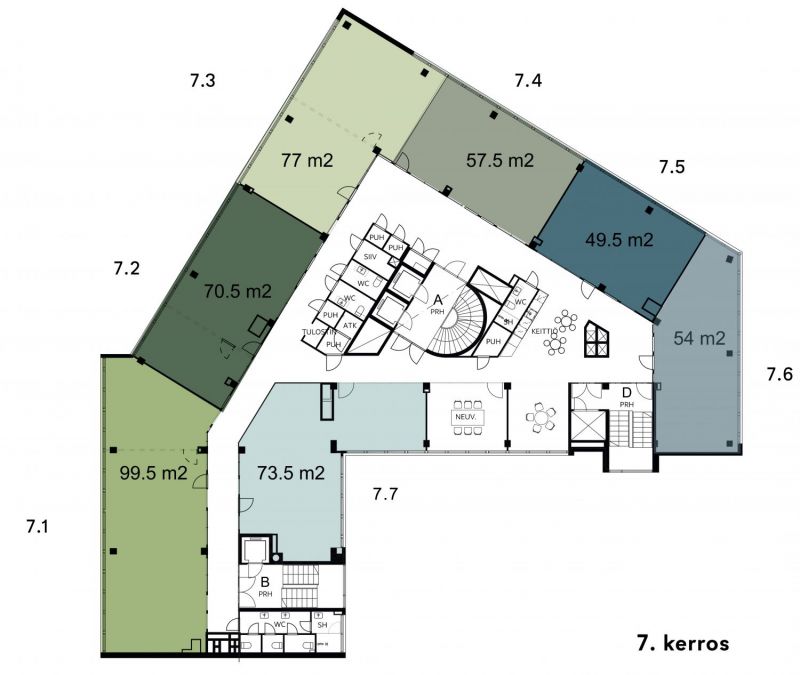 Rakennuksen seitemännestä kerroksesta on mahdollista vuokrata erikokoisia, tehokkaita toimistotiloja. Tyylikkäät ja huolella suunnitellut tilat tarjoavat viihtyisän ympäristön ja sujuvan työpäivän. Kerroksessa on yhteiskäyttöinen keittiö, neuvotelutila, puhelinkoppeja sekä wc:t.