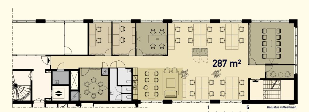 Kiinteistön kolmanteen kerrokseen valmistuu marraskuussa 2025 täysin uudistetut ja sisustussuunnittelijan konseptoimat pientoimistotilat. Tarjolla on eri kokoisia toimitiloja 82 m² aina 287 m² asti, jotka kaikki on suunniteltu huolella pohjakuvien mukaisesti. Kaikissa tiloissa on omat wc-tilat ja keittiö. Tilojen yhteyteen tulee kolme yhteiskäyttöneuvotteluhuonetta. Kuvat ovat yleiskuvia kiinteistön tiloista.