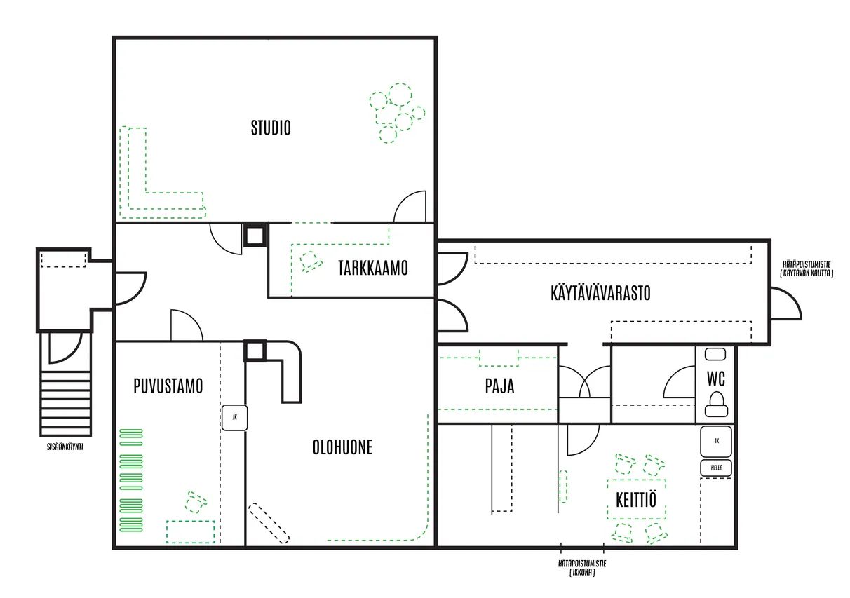 Kahvila, studio/ateljé, koulutus, parturi- ja kampaamo, popup, bändikämppä, coworking